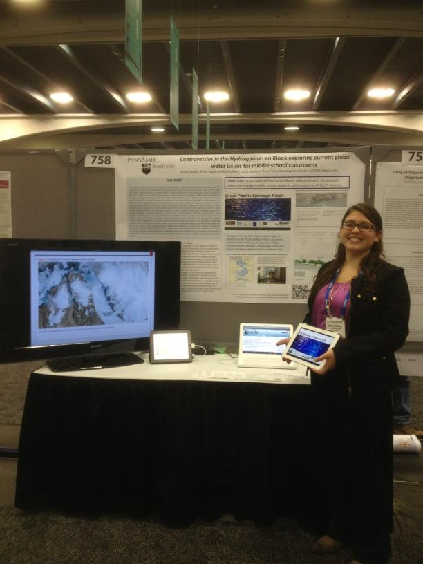 Abbey and I headed over to the convention center to get her poster set up in poster booth #758 (recall that there are over 2,300 posters that are presented each day of the conference!). When we finished getting the poster up, we spoke to some of the other poster presenters across the aisle. Declan De Paor (Old Dominion University) was kind enough to show us some great Google Earth innovations he and his graduate students are working on. We also headed over to look at posters in the Public Policy group, and we had a great conversation at a poster covering Richard Alley’s Earth: The Operator’s Manual.