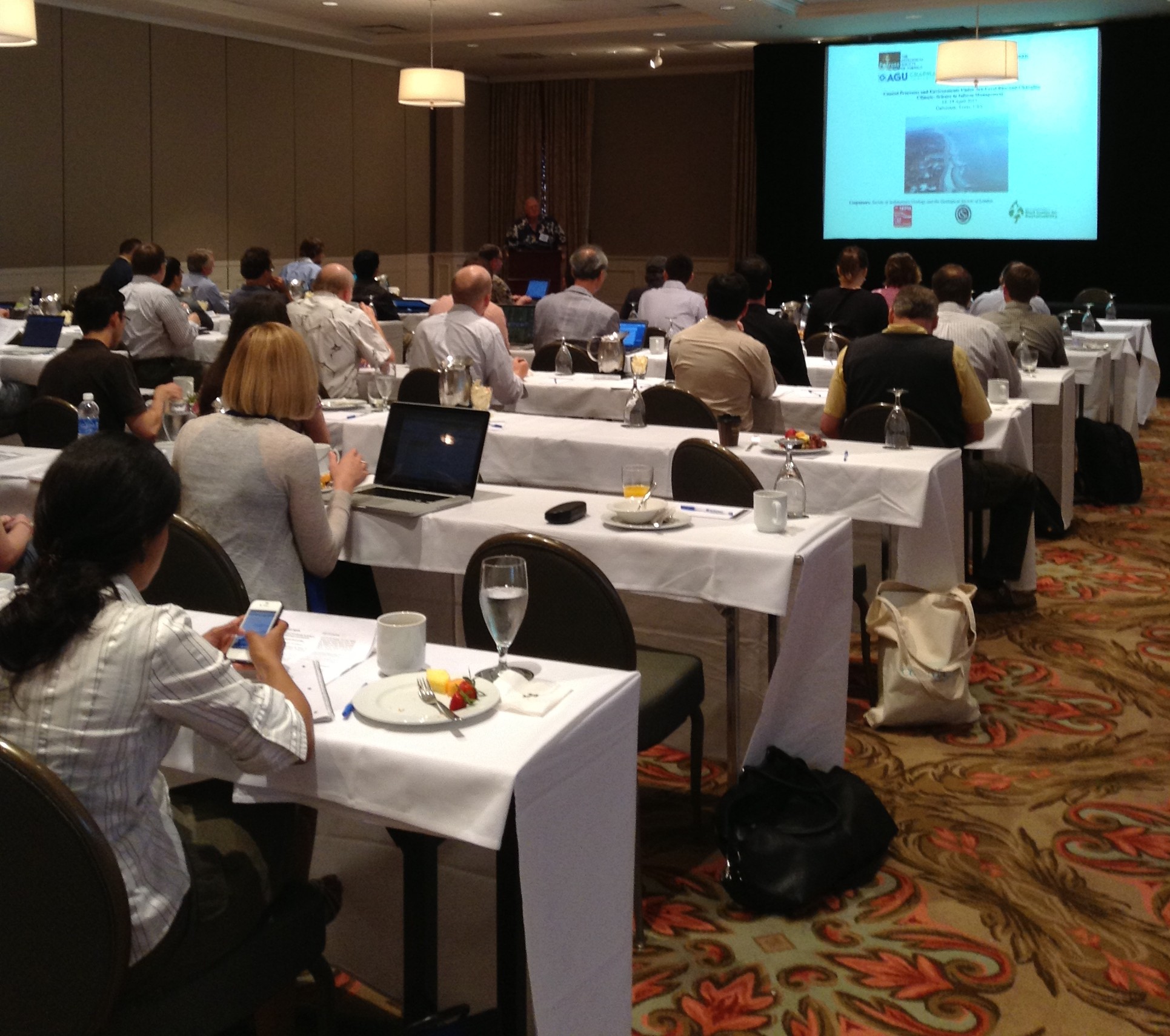 Today (Monday) had fourteen talks discussing the record of sea-level rise. The talks were given by researchers from institutions such as the University of Florida, Tulane University, Vanderbilt University, University of Massachusetts, and the Woods Hole Oceanographic Institute. My students can even appreciate some of the talks, based on the titles (seeing as we just talked about “what makes a good title” in class last week!):