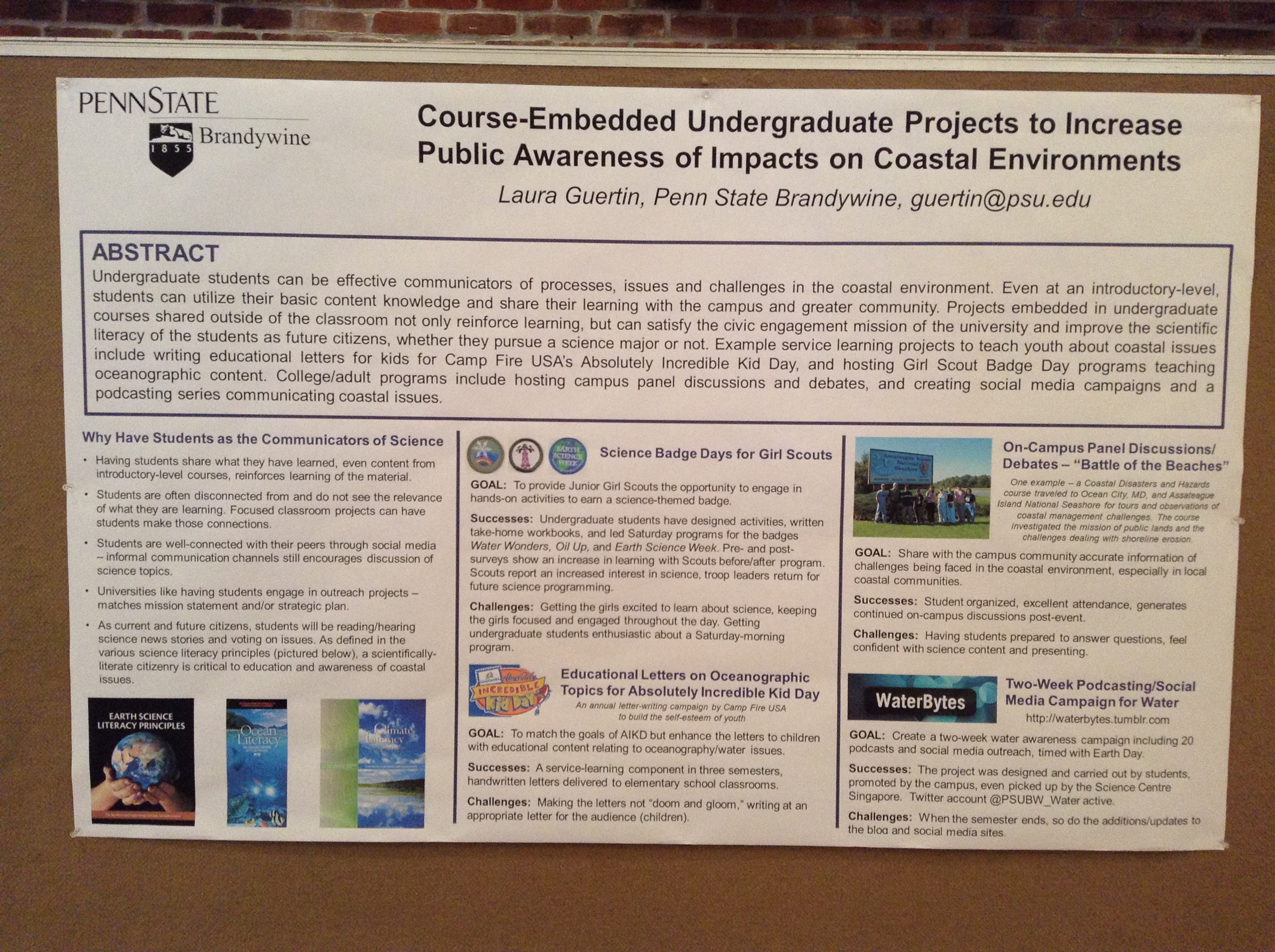 Oh, and before I forget… I should show an image of my poster! I’m not giving a talk, but instead presenting a poster of the importance of having undergraduate students engage in communicating oceanographic and coastal issues while they are students, even if they are not science majors. All students are voting citizens that read/hear the news and need to be ready to engage in conversations and be actively involved in charting the environmental future of the planet. I’ve had some great conversations with people here at the conference about the projects my students have done – it is a great feeling to know that others (besides myself!) get excited about the impact students can have.