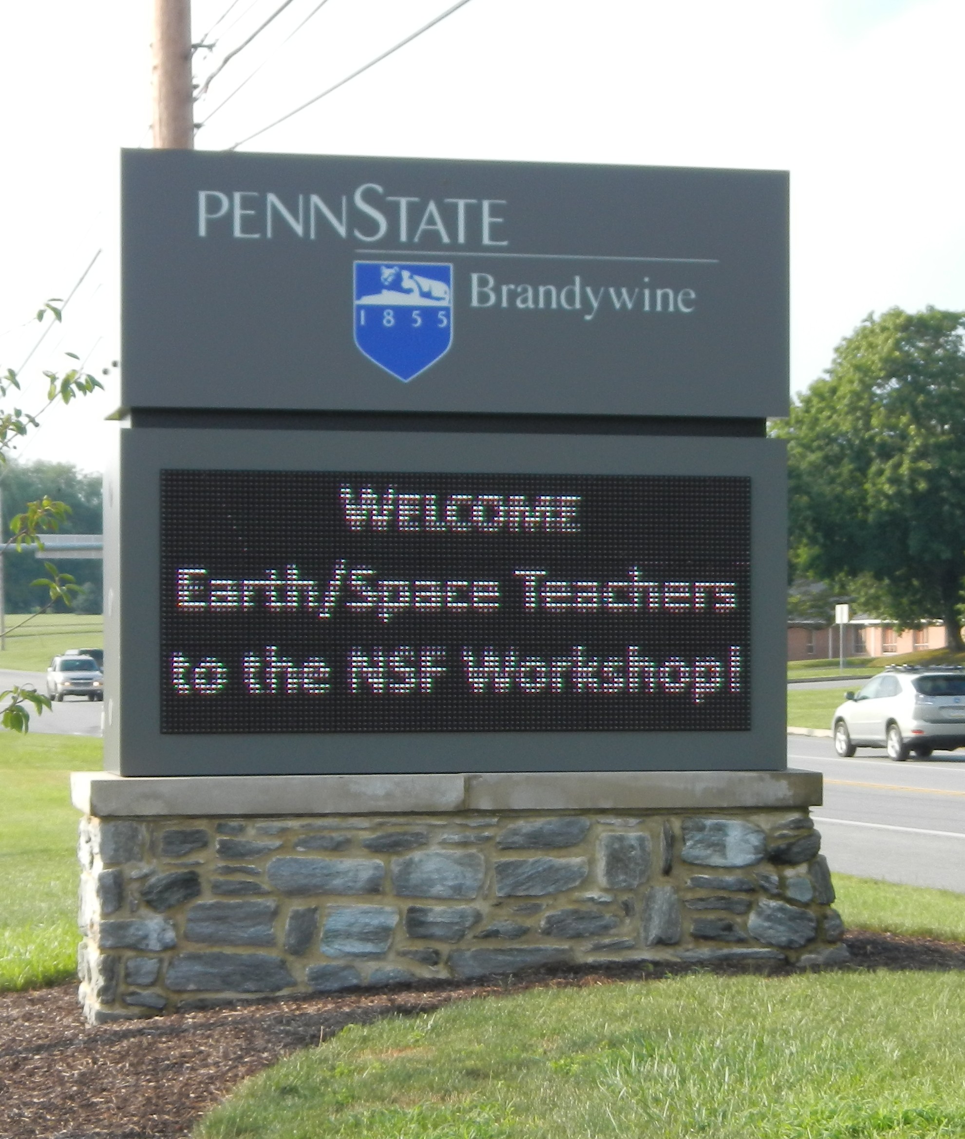 From July 21-26, we welcomed 15 teachers from central and southeastern Pennsylvania to a week-long workshop on solar system astronomy. One of the co-leaders of the workshop was Dr. Tim Lawlor, who many students have taken astronomy with on campus during the semester. I assisted with some basic logistics for this program – providing markers, rules, ordering pizza for lunch, etc. During the following week, July 28-August 2, I co-led the workshop on plate tectonics. Eighteen teachers joined myself and my co-leaders for activities on volcanoes, earthquakes, and mountain building to reinforce content knowledge and to present ideas for best pedagogical practices. The campus wrote up a really nice article celebrating these teachers coming to campus, and even our lighted sign along Route 352 welcomed our visitors!