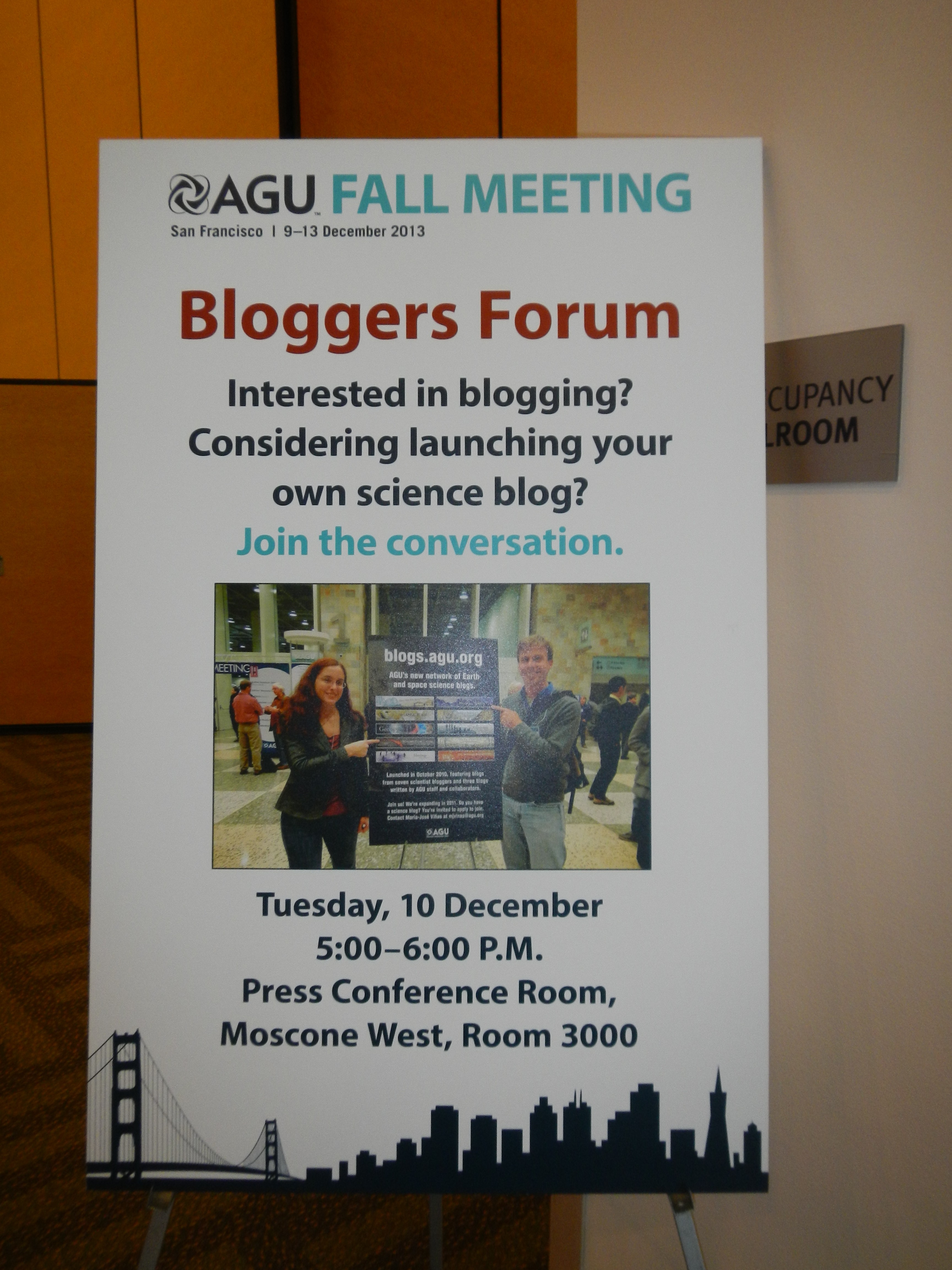 […] For the rest of the time, we were encouraged to head over to the AGU Exhibit Hall to attend Hyperwall talks by NASA Scientists (see my Thursday post for a summary of the Hyperwall talk I attended later in the week). I needed to head on over to the AGU Bloggers Forum to serve as a panelist, and then I saw the group at the final event of the night, the AGU Open Mic for science-themed music, dramatic readings, etc. (see my Bloggers and Open Mic post). […]