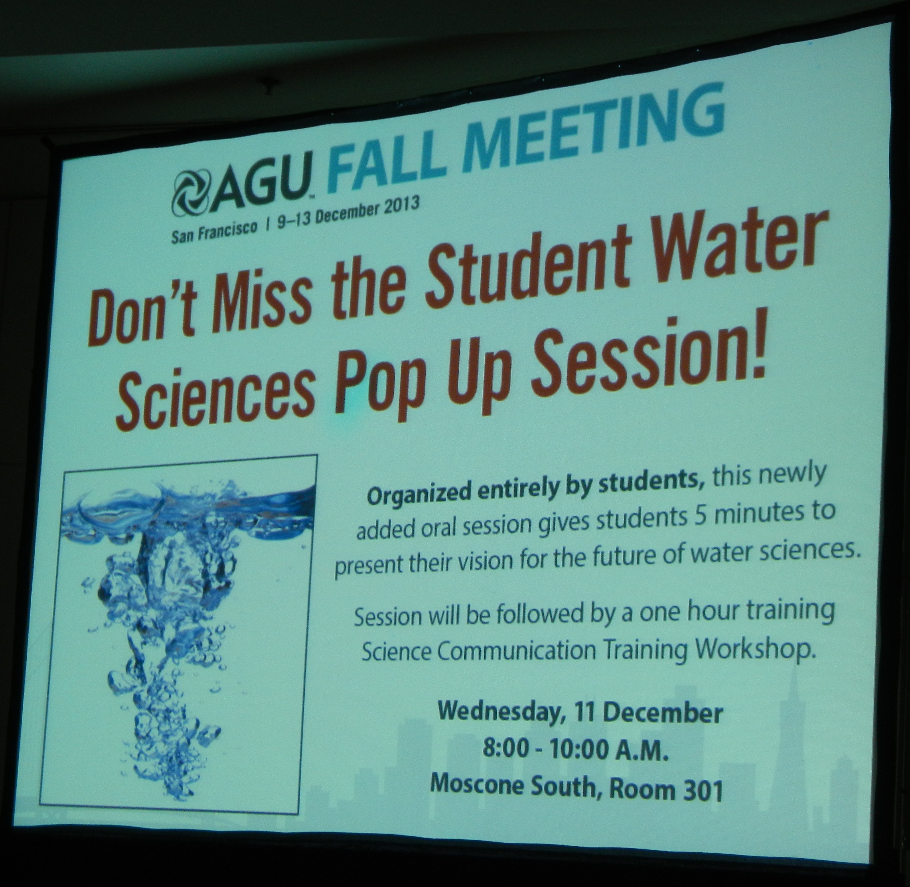 Today is “hump day” of the week-long AGU fall conference. The day started bright and early in the morning (all of the days actually start bright and early, with the first talks beginning at 8AM), when I attended the Water Pop Up session. This format of session was a first for AGU. In this session, organized by graduate students, each student had only 5 minutes to speak. Now that may seem like a really long time, but it is very short when you think of trying to include your data and message. My former undergraduate researcher Abbey Dufoe, now graduate student at the University of Montana for environmental studies and natural resources journalism, was one of the speakers. I was so proud to see her give her first oral presentation at a conference! All of the students did very well, and I liked the variety of talks that this format allowed.
