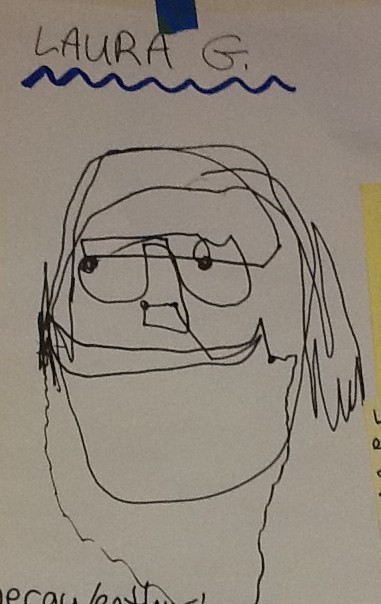 I won’t share any of the “ideas” that were generated or discussed during the week – those ideas belong to the participants that were in the Sandpit. But the techniques we used are certainly ones worth some mentioning. I look forward to exploring more about how to brainstorm to the third third, providing feedback as a positive/potential/concern (with the “concern” always phrased as a question starting with “how can you…”), and the Picasso in a Paper Bag drawing exercise (see the image to the left (yes, that is supposed to be me) that was drawn by one of the workshop attendees). We also did several rounds of “speed dating” to break the ice and get to know one another, which actually was incredibly productive.