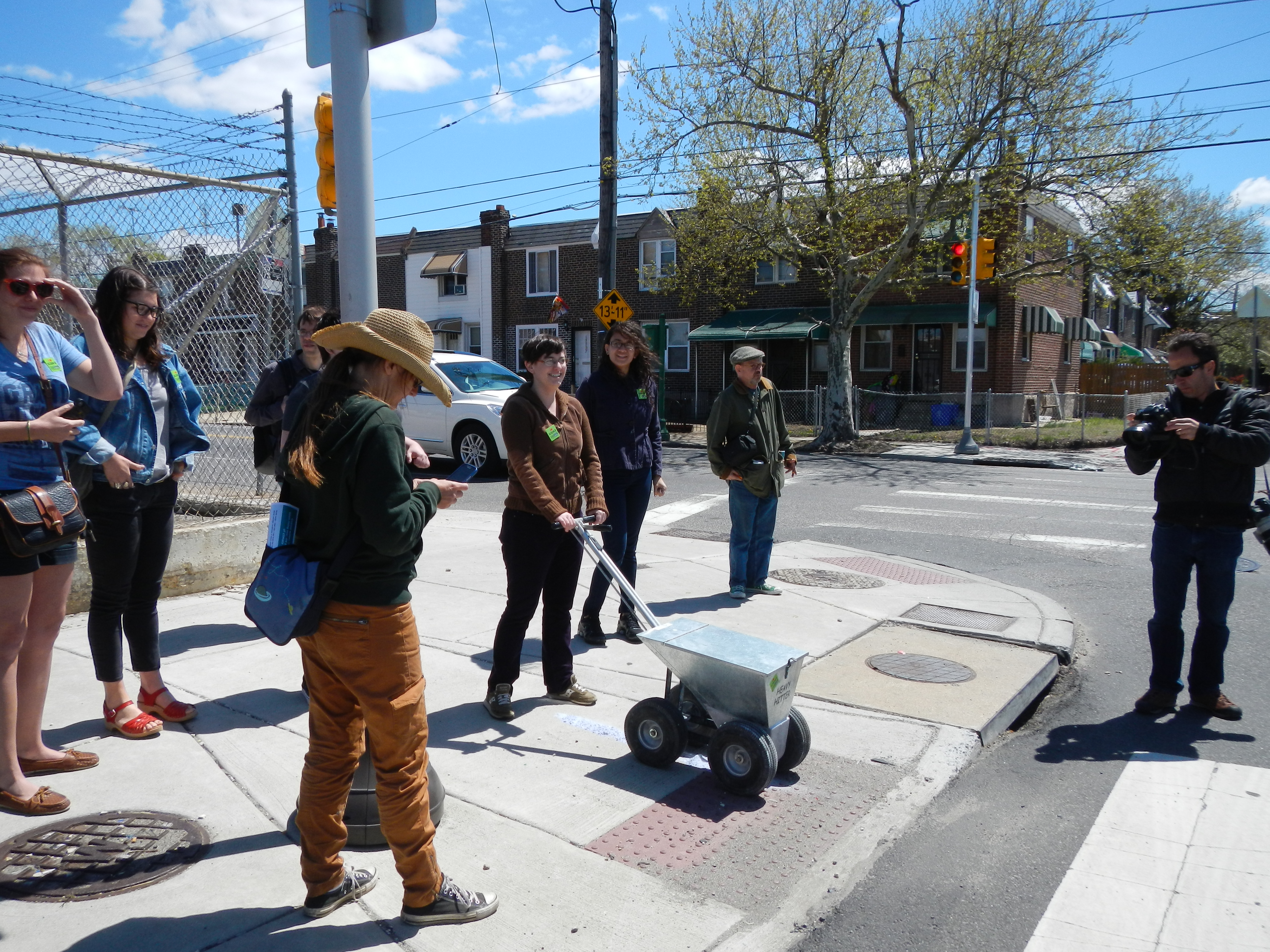 Were we effective with the overall goal of the project, “demonstrating how art and science can connect to promote community action, preparation, and resilience”? There were several sections we walked by (such as pictured here) where no people were out, and I wonder what they thought about the chalk dust on their sidewalk. However, I saw via Twitter (#HighWaterLine) that there were some spots the group walked by where they were able to engage in conversation with people outside. I look forward to investigating the websites of organizations Eve recommended working on climate change impacts in Philadelphia, such as the Philadelphia Water Department, New Kensington Community Development Corporation, and the Climate & Urban Systems Partnership.