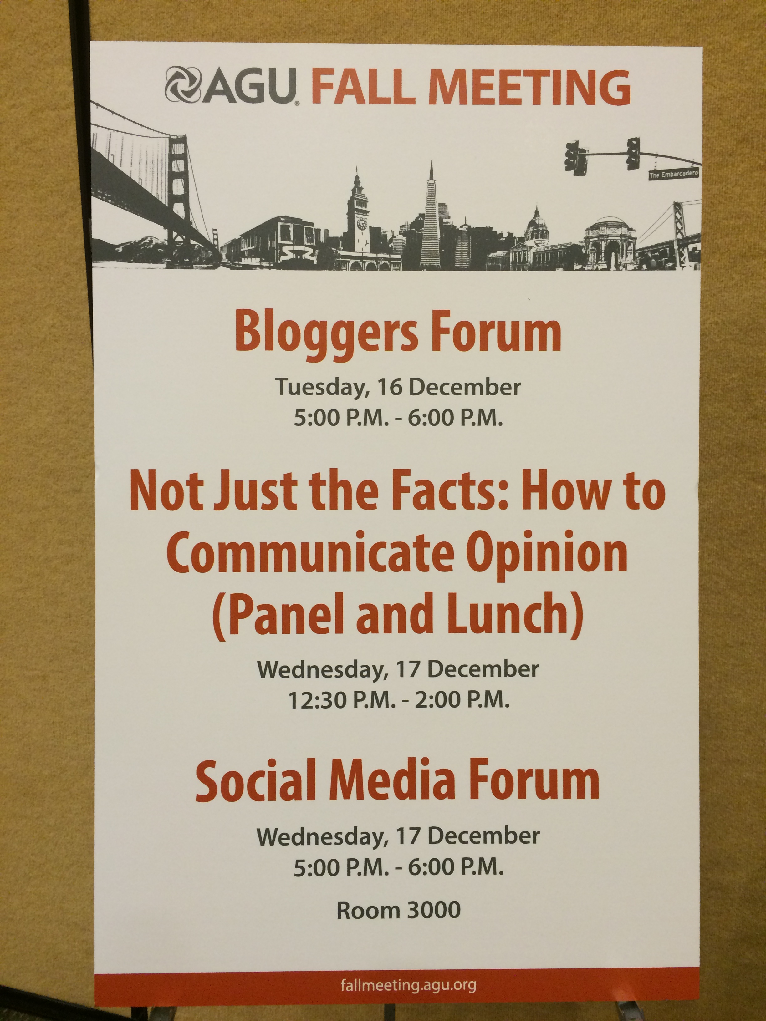 I dashed through the rain between convention center buildings to head on over to the Bloggers Forum. I blog for AGU at the AGU Blogosphere as GeoEd Trek on geoscience education and educational technology, and I was honored to be asked to join their blogging panel. Over 50 people came to the session to hear a “recipe for a good blog,” tips on how to balance blogging and personal/professional responsibilities, how to choose topics, how to measure success, and how to get the word out. The most rewarding part for me was answering a question from an undergraduate student and speaking with her immediately after the panel about her strong interest in blogging and how to expand upon the blogging she already does.