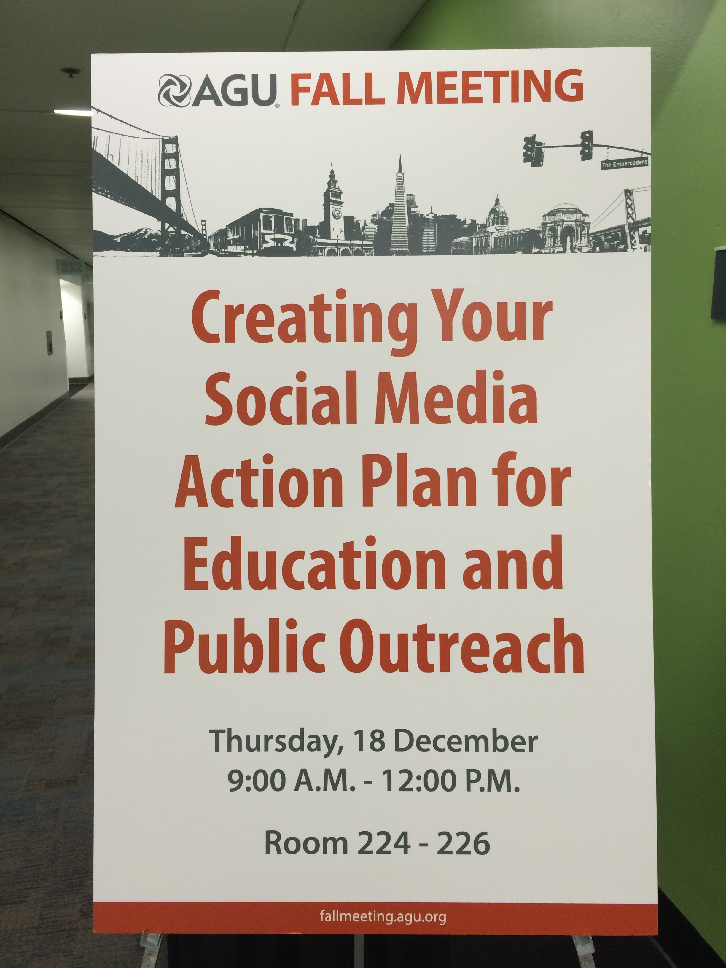Note that the tweet above was posted two days ago – you can imagine how all of us feel that are still at the 2014 AGU Fall Meeting (and we still have one more day to go!). I started off the morning in a 3-hour workshop titled Creating Your Social Media Action Plan for Education and Public Outreach. The goal of the workshop was to walk away with a plan to utilize social media for a specific project or purpose. I have a new project that I am developing, and I was looking for ideas on how to think about and approach using social media from the beginning. This workshop was very helpful in getting me to think about short- and long-term goals, the target audience, who/what resources are available, and how to measure success. Stay tuned, female STEM majors at Penn State Brandywine – something is (hopefully) coming your way real soon…