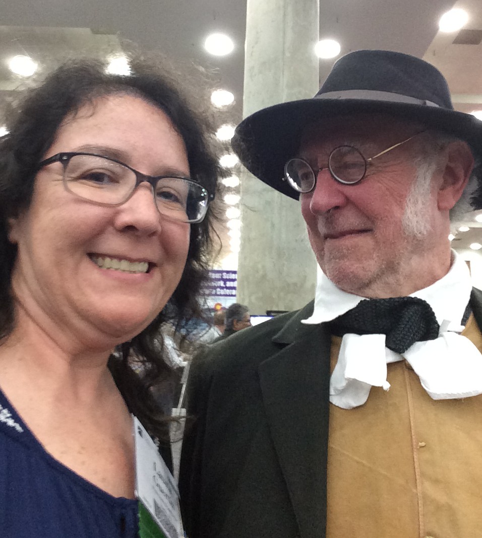 I zipped back to the Exhibit Hall to see the William Smith Map Display – 1st Edition Facsimile Print.” This map was on display for limited hours each day. What’s the big deal about a map? This map is “the” map that changed the world! (according to Simon Winchester’s book of the same title – by the way, Winchester was here at the conference to give a talk and for a book signing) It is the 200th anniversary of “a delineation of the strata of England and Wales, with part of Scotland; exhibiting the collieries and mines, the marshes and fen lands originally overflowed by the sea, and the varieties of soil according to the variations in the substrata, illustrated by the most descriptive names.” This 1815 geological map was hand drawn by Smith, considered the father of stratigraphy and faunal successions in the geologic record (learn more about the map and William Smith in this press release). I was even able to grab a selfie with “William Smith” himself!