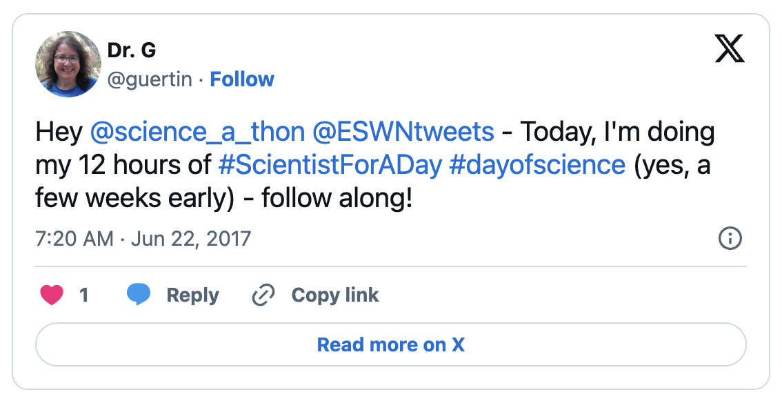 I’m participating in the Science-a-thon (https://www.scienceathon.org/), a global effort by scientists to document their lives for 12 hours on one day with 12 photos. Photos are being posted on Twitter and Instagram to offer a glimpse into what a day in the life of a scientist looks like. I blogged about the project on my AGU blog, and the project is also raising funds to support the Earth Science Women’s Network (https://eswnonline.org/) (see my CrowdRise fundraising page).