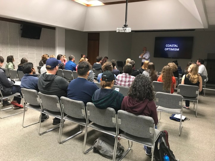 We then gathered for our official welcome from Dr. Craig McClain, Executive Director of LUMCON. I thought it was a very smart beginning, providing each of us a copy of LUMCON’s Equal Employment Opportunity/Affirmative Action Policy. There is no question that Dr. McClain is creating a supportive and inclusive environment for all of us during our time at the center. After sharing the history of LUMCON, and presenting us with a few teasers to heighten the tension, we finally learned the theme of our gathering: COASTAL OPTIMISM.