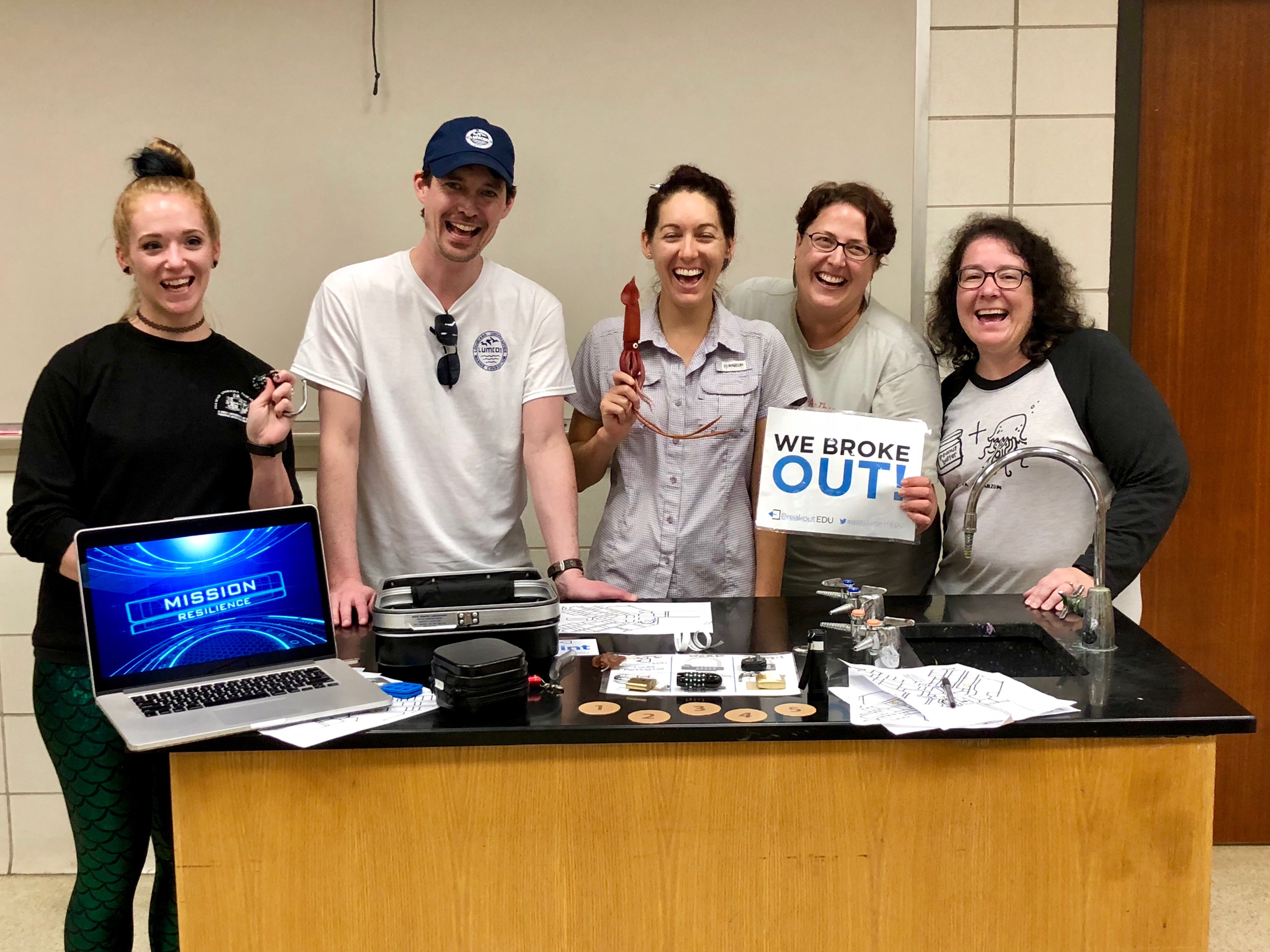 After lunch, myself and several other workshop participants assisted in testing an educational activity developed by one of the teams. Instead of being a part of an escape room, we were trying to break in to a box (the product is known as BreakoutEDU). We raced around the laboratory and against the clock to find clues that would allow us to remove several locks to get an object inside. This was so much fun and allowed us to learn more about LUMCON and our own abilities to work as a team. As you can tell from the photo, we were successful!