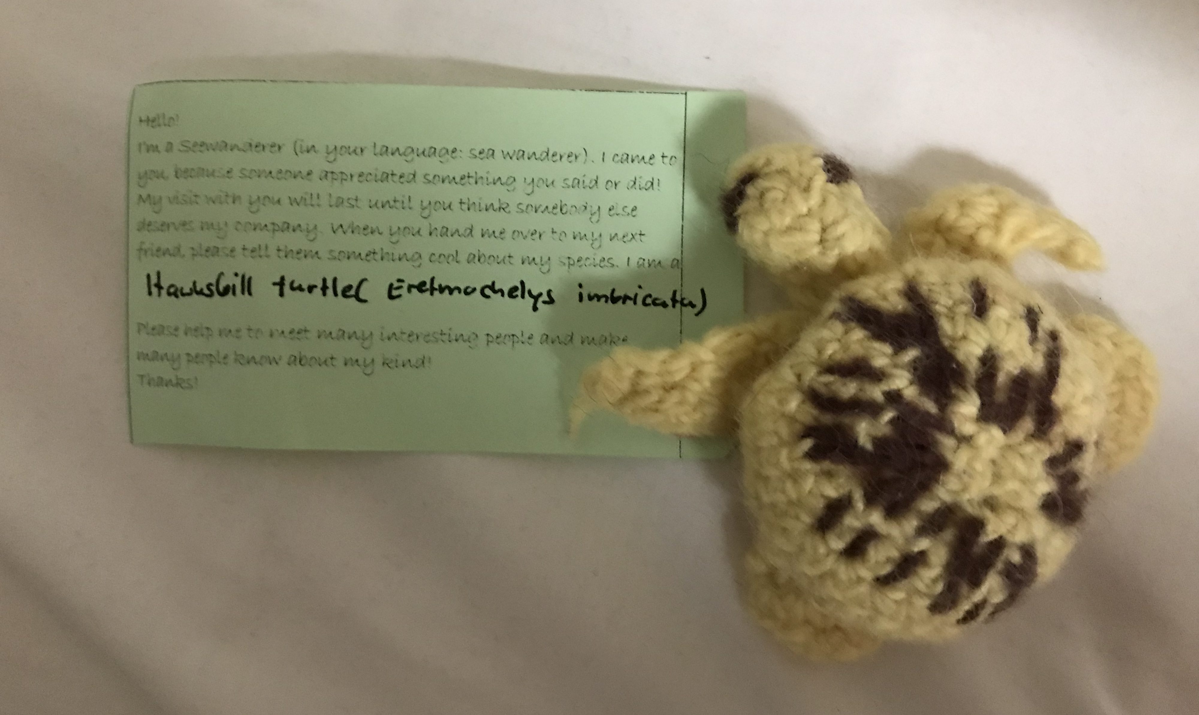 At the end of the introductions, Gabriele Kerber came up to me and presented me with a gift. Gabriele is a freelance science writer from Germany. She is also a crocheter and makes small marine animals and passes them along to people. This adorable sea turtle is part of her “Sea Wanderer” pay-it-forward program.