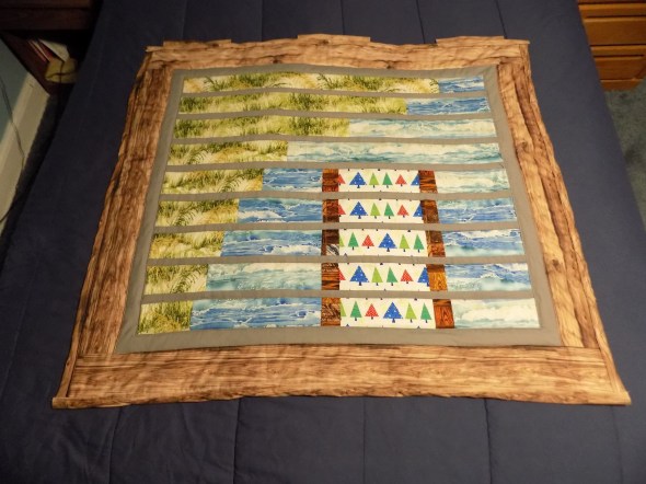 This is my story of coastal optimism – a story of habitat loss and degradation that is slowed by the placement of discarded Christmas trees. The quilt measures 42 inches wide by 38 inches in height with fabric from Zook’s Fabric Store (Lancaster), The Old Country Store (Lancaster), and JOANN Fabric & Craft (Springfield).