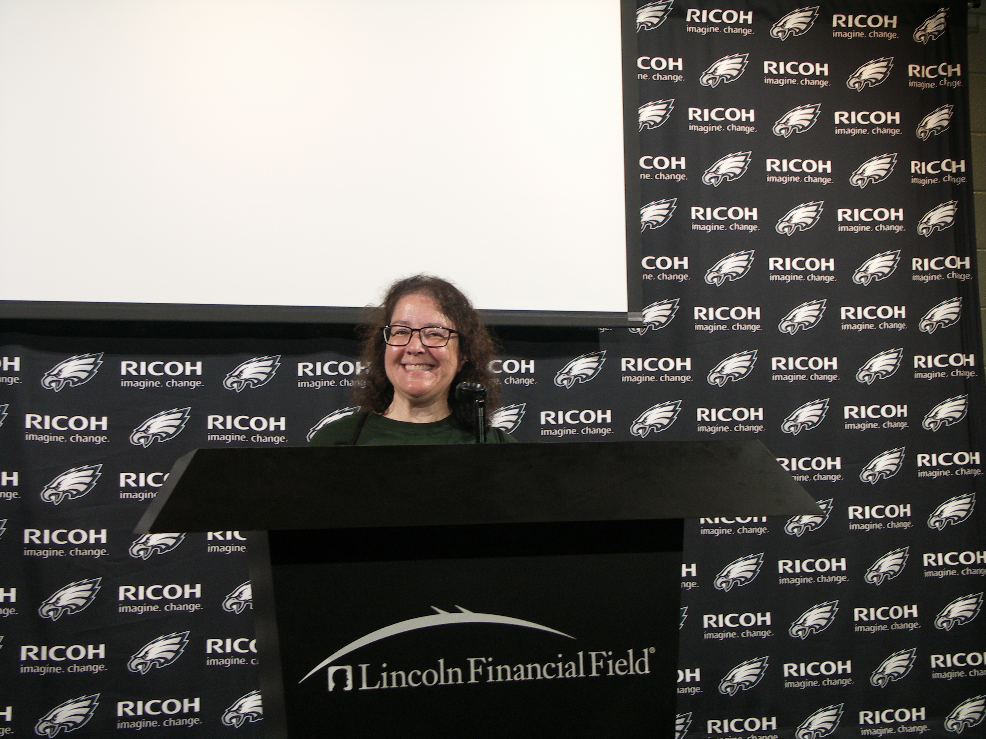 While in the press conference room, we learned about the 3,300 employees it takes on game day to serve a sold-out stadium that seats 70,000 fans (in seats made of recycled material, of course!). We also heard about the community efforts of the Eagles organization, such as Playground Build and Eagles Autism Challenge. [I might have missed this on the tour, but there’s also the PGW Field Goal Forest]