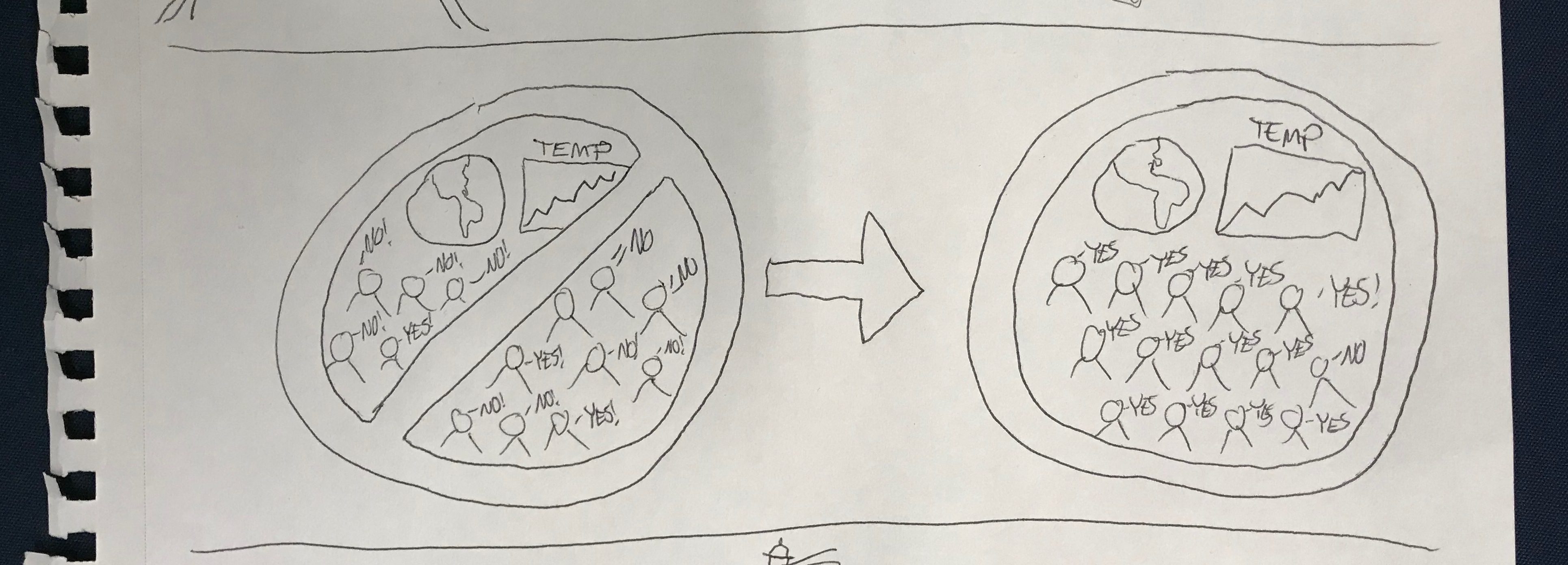 (The circle on the left shows global warming, and an audience of scientists disagreeing that our increasing temperatures are being caused by human use of fossil fuels, shown by a mixture of yes and no responses from the audience. When, in reality (on the right), there is ~97% agreement among scientists that humans and fossil fuel use is causing our current warming trend, shown by the overall yes responses and one no.)