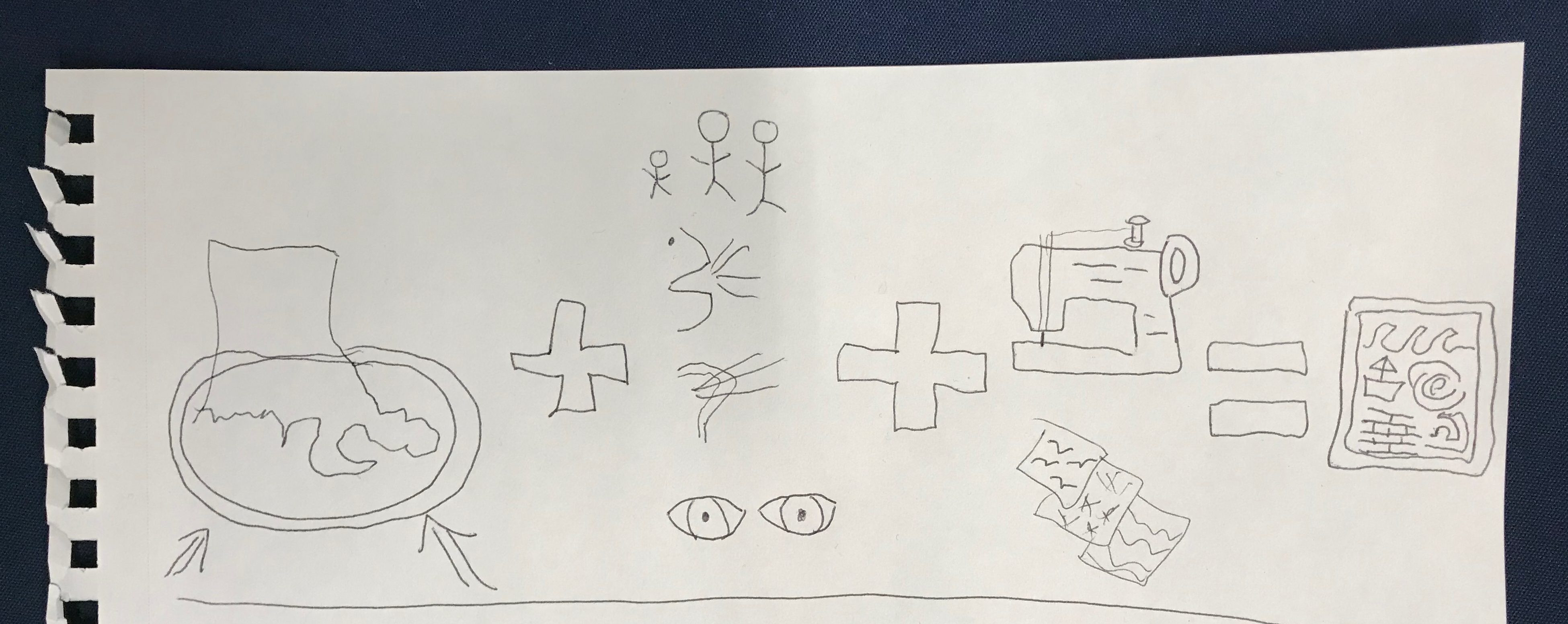 (That’s supposed to be the outline of Louisiana on the left, moving towards people telling their stories which involves listening and making visual observations of the local environment, then adding in my sewing machine and a collection of patterned fabrics, and finally, a quilt that tells a story.)