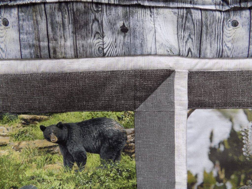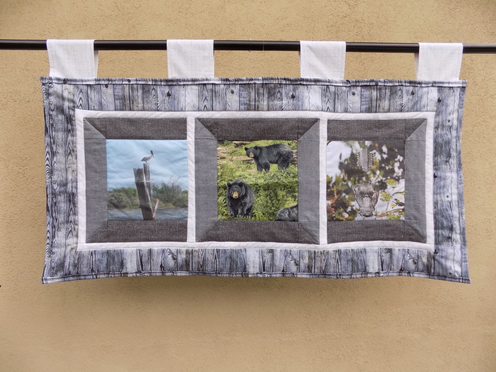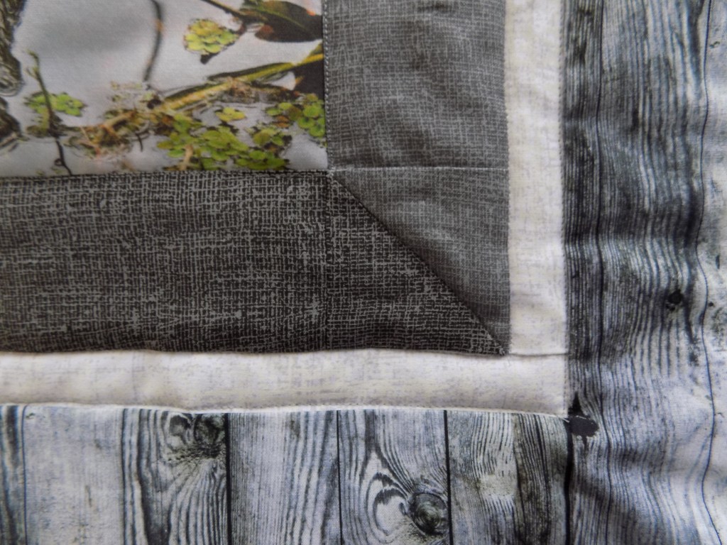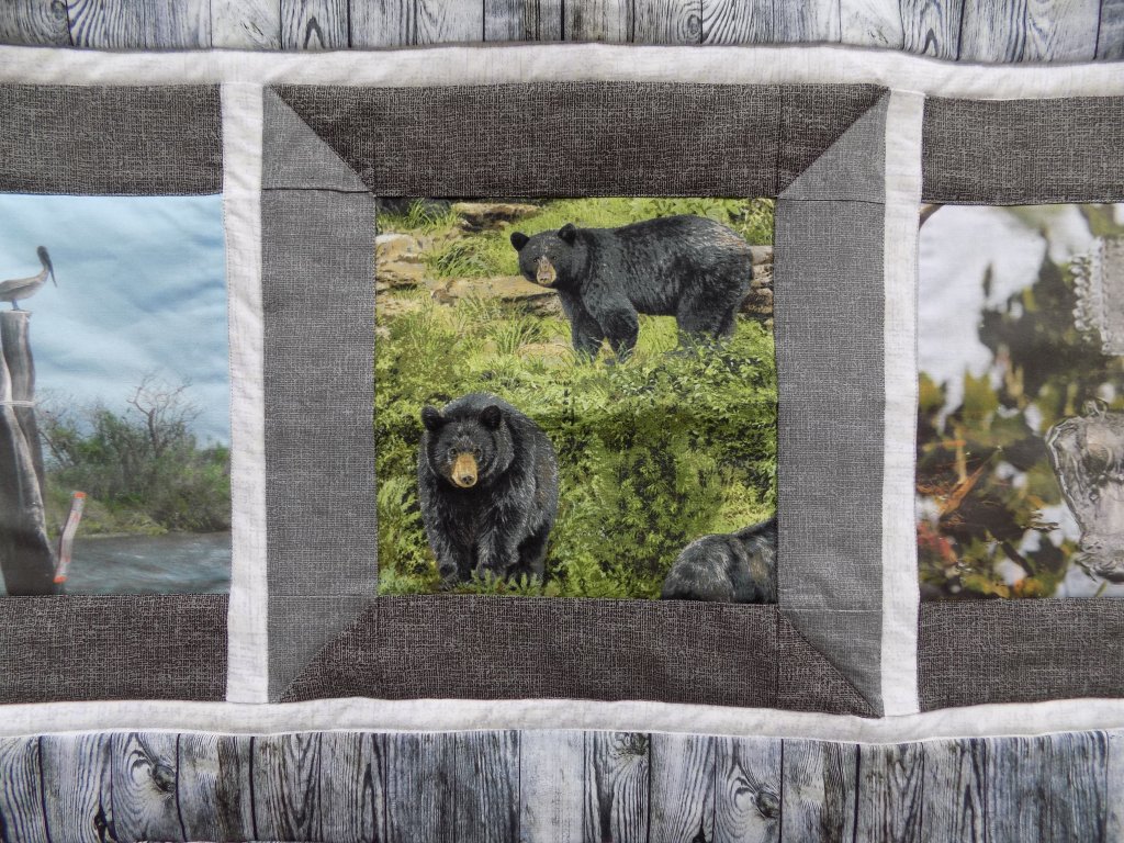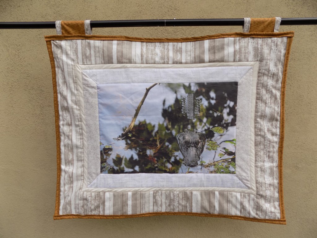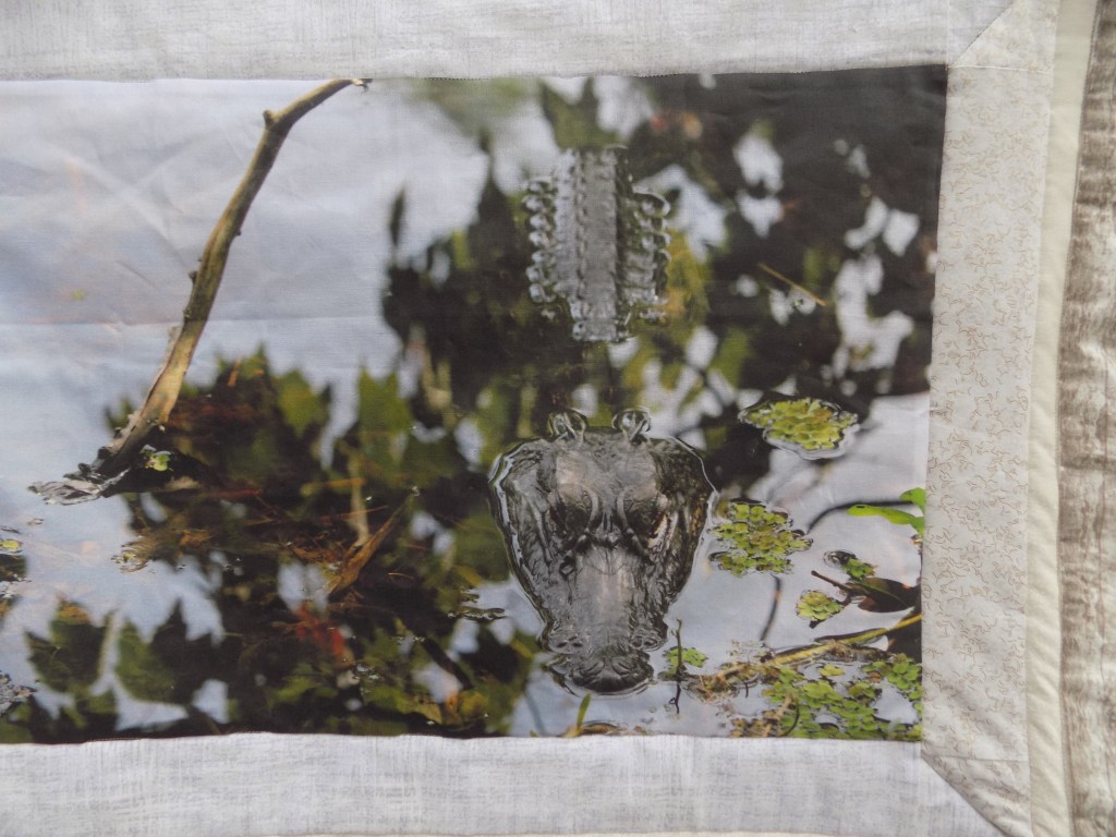The pelican photo I took as part of the OCEANDOTCOMM event held at LUMCON in 2018. The bear fabric was purchased from Log Cabin Quilt Shop in Bird-in-Hand, PA. LUMCON Director Craig McClain was kind enough to let me use his alligator photo for this quilt – so I created a special version of the quilt just for him. He captured this photo at Jean Lafitte National Historical Park and Preserve and posted it on Instagram in 2020.