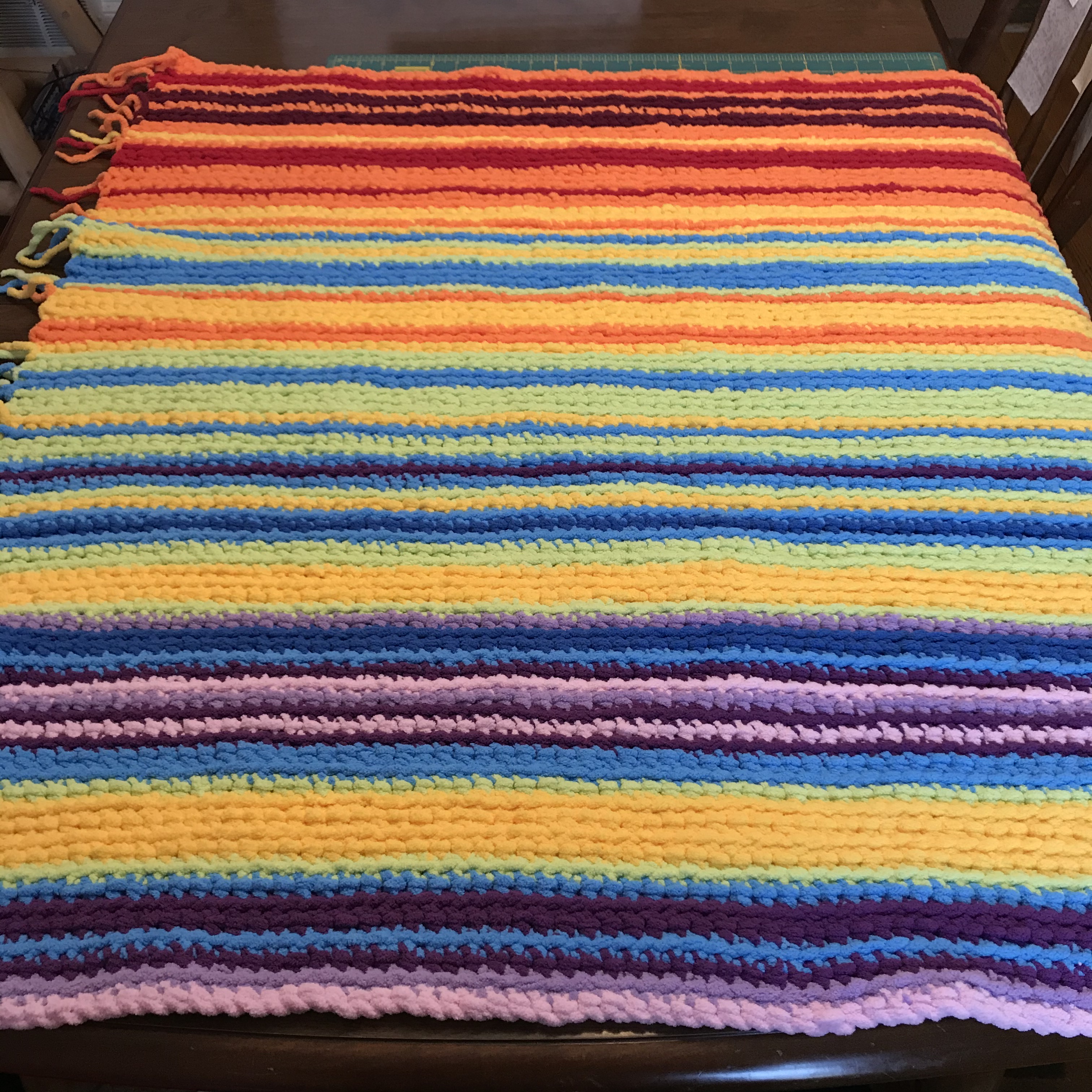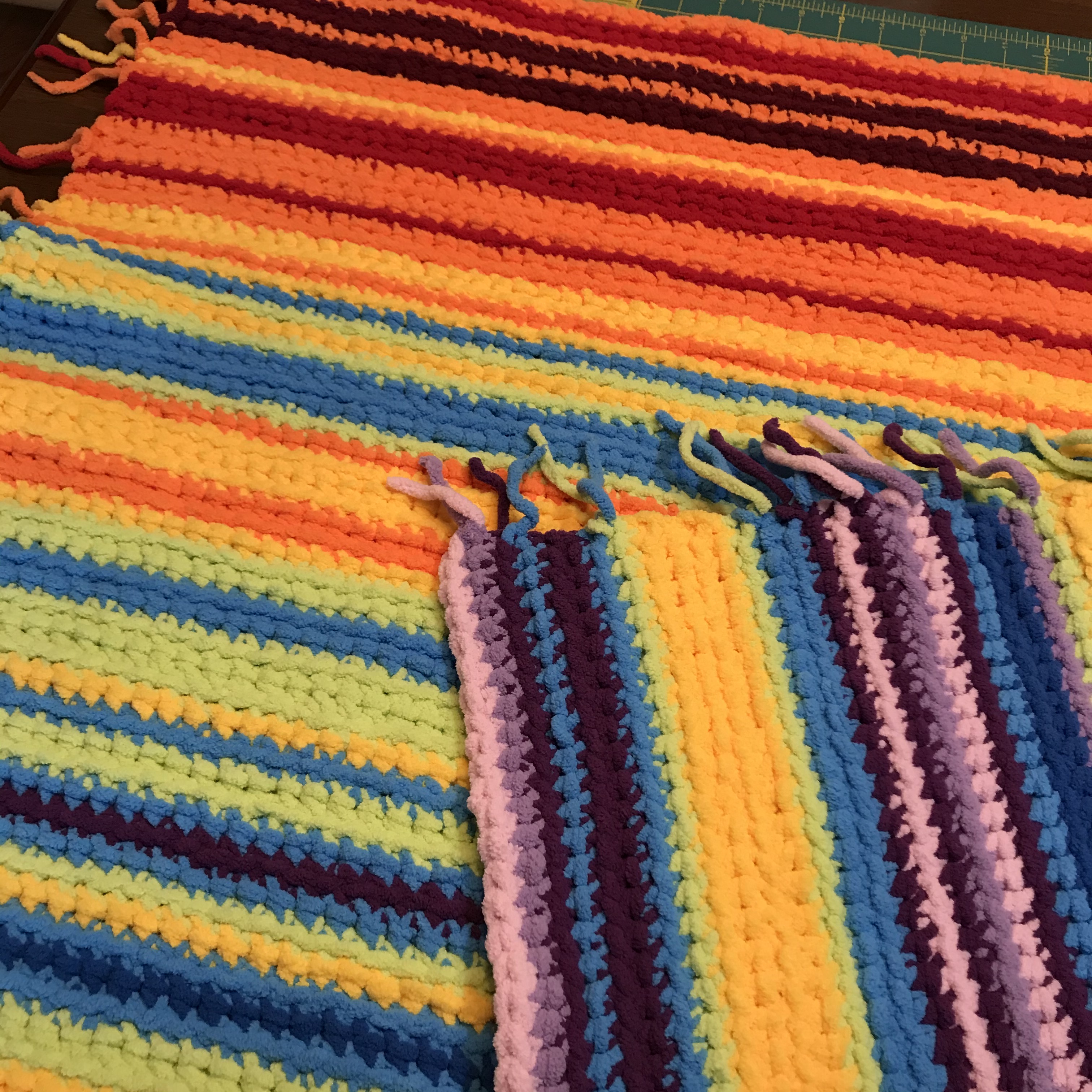 I’ve created another blog post as to how and where to find temperature data, especially if the baby is not born in your local area. And there are no rules that say you have to crochet a row each day – one can certainly wait until after the first three months have concluded to determine the colors to use with the temperatures. And there is also no expectation to use the rainbow colors – red for warm temperatures, and blue/purple for cooler temps. I’ve actually been criticzed for using the ROYGBIV scale, as it can be difficult for those with varying degrees of color blindness to see the difference across the scale. I encourage you to use which colors you feel comfortable with (and which colors you have in your collection and available to use!). I’ve been a fan of using the super bulky [6] Bernat Blanket yarn (regular, Baby, Brights) for my rainbow effect.