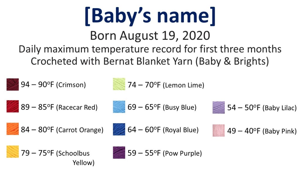 It is very simple to do. Once the baby is born, I can look online to see what the daytime high temperature was, and each day add a new row to my blanket. After three months, I have a very personalized baby blanket as a gift! Granted, the gift is then three months late (after the baby is born), and I have to guess what the range of temperatures might be to establish the yarn color scheme from the start, but it is worth this when the reaction comes in from the newborn’s parents.