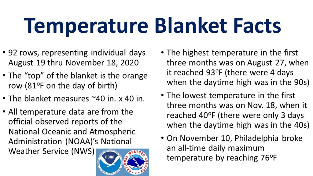 I should note that I focus on daily weather data, not how much the temperature varies from the climate record for that date. Having the blanket share climate data would have it look like something you would see in the climate warming stripes graphic – an all-red blanket, and a reminder that the baby was born into a warming world. Temperature data is much more friendly and less anxious when it stands alone.