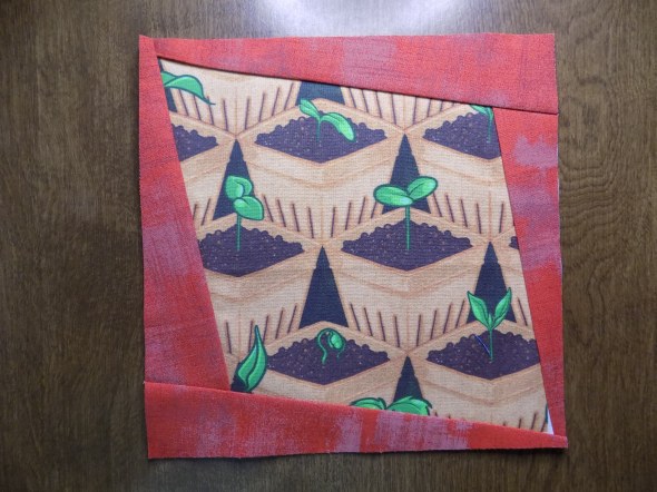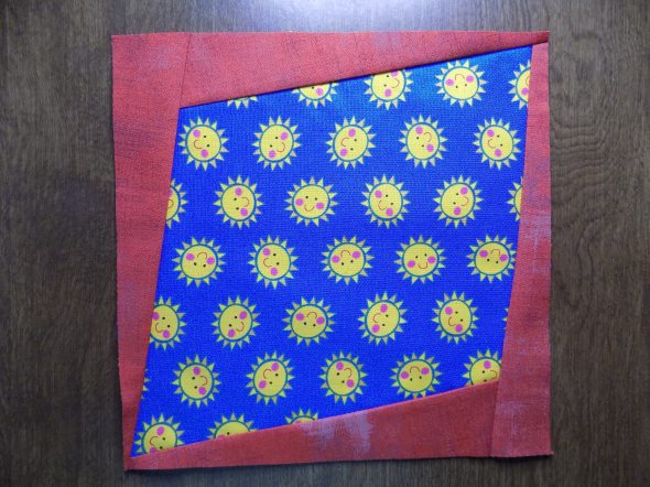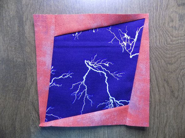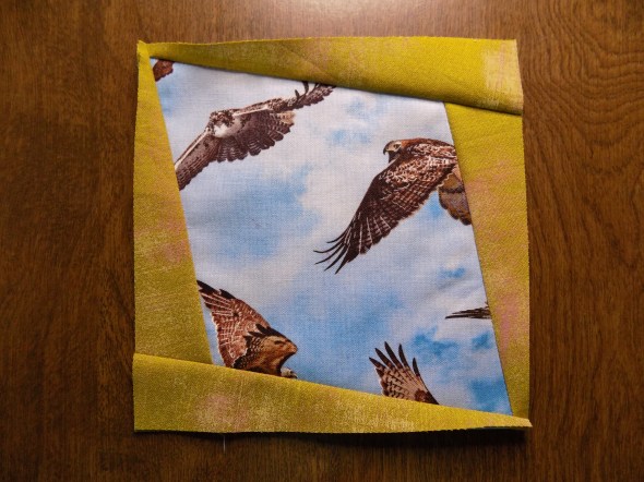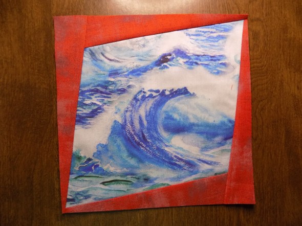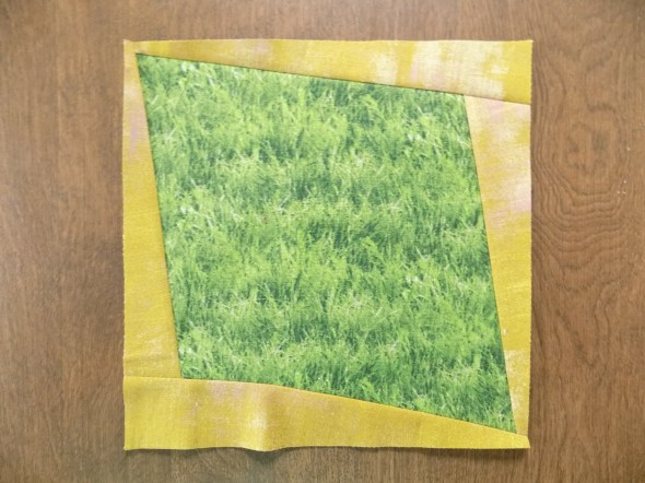 The panels of fabric around the center are cut as simple squares on point, with the pattern in each fabric taking the viewer through Baurick’s story, “Fire emerges as an ally in the fight to save Louisiana’s marsh.”