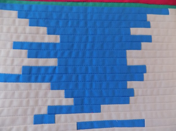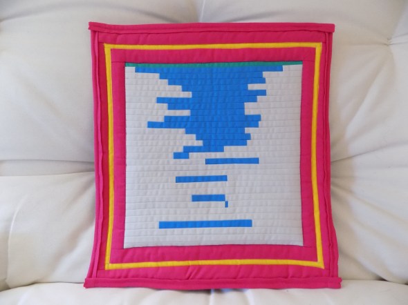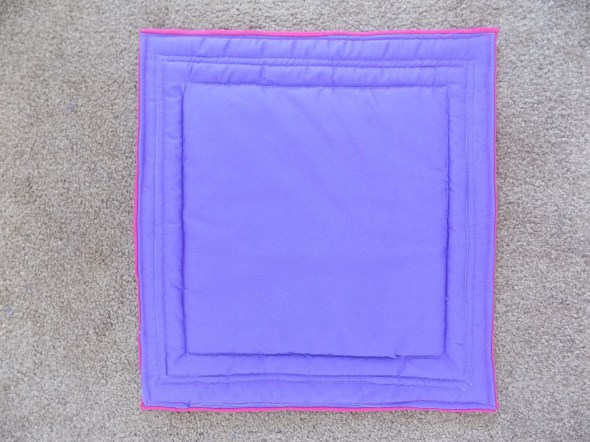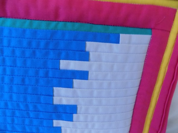 The back of the quilt is where I used the purple. I don’t think I was required to use all the colors in the quilt, but they all made it in there! My finished quilt measures approximately 14 inches by 14 inches.