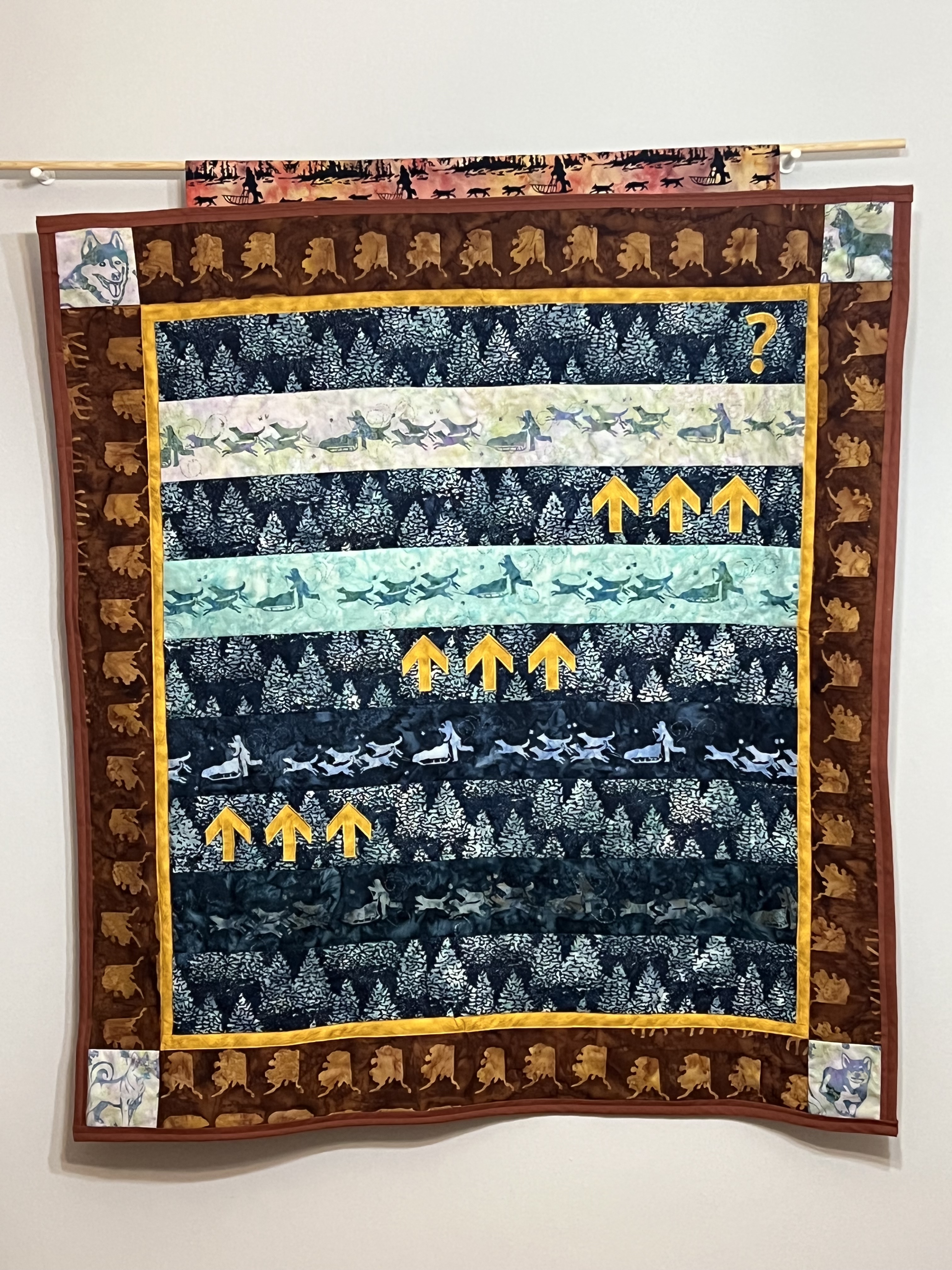 Starting at the bottom of the quilt, the dark batik fabric was used to represent colder temperatures, with the sleds facing to the left to symbolize the race heading from east to west across Alaska. As one moves up the quilt, there are golden arrows for warming temperatures – three sets of arrows representing the three times when the race was shifted to the north because of environmental conditions. The batik fabrics with the sled dogs and mushers also becomes lighter in color moving up the quilt to represent the warming temperatures over the years. At the top, I placed a question mark, questioning how much longer this race will be able to continue because of the warming temperatures across Alaska, a point driven home by mushers and dogs on the warmest color of fabric for the quilt hanger.