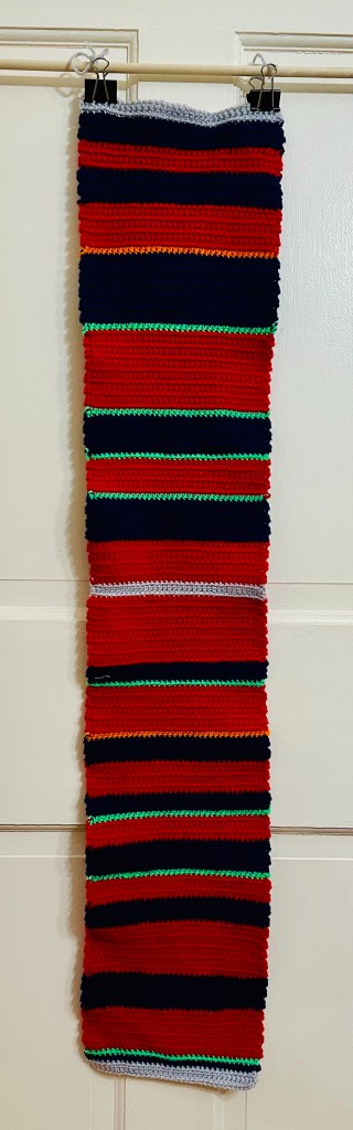 Each row represents a play, or a down. Penn State started the game with the ball, but when three downs and then had to punt; therefore, I crocheted four blue rows. Next, Utah did the same – three plays then a punt, so four red rows. Next, Penn State had a first down, another first down, then a second, a third, and a punt, resulting in five crocheted rows. And I continued this pattern from there.