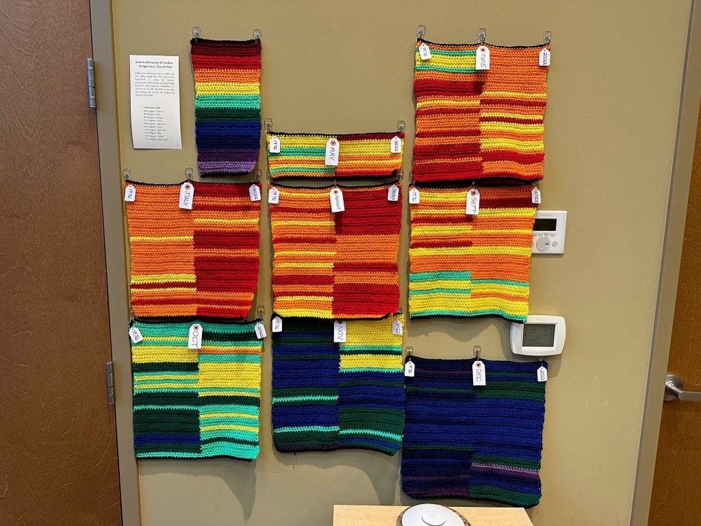 In 2018, I started my journey into quilting science stories, thanks to my experience at OCEANDOTCOMM in Louisiana. I’ve been crocheting temperature data even longer. But I haven’t had many opportunities to share these creative pieces with audiences beyond short YouTube videos I created describing most of the quilts. I had a display of my Stitching Hope for the Louisiana Coast quilts on display for the attendees at the 2021 American Geophysical Union Fall Meeting. And in 2022, a local arboretum provided me the incredible venue and support of exhibiting my weather- and climate-themed work.