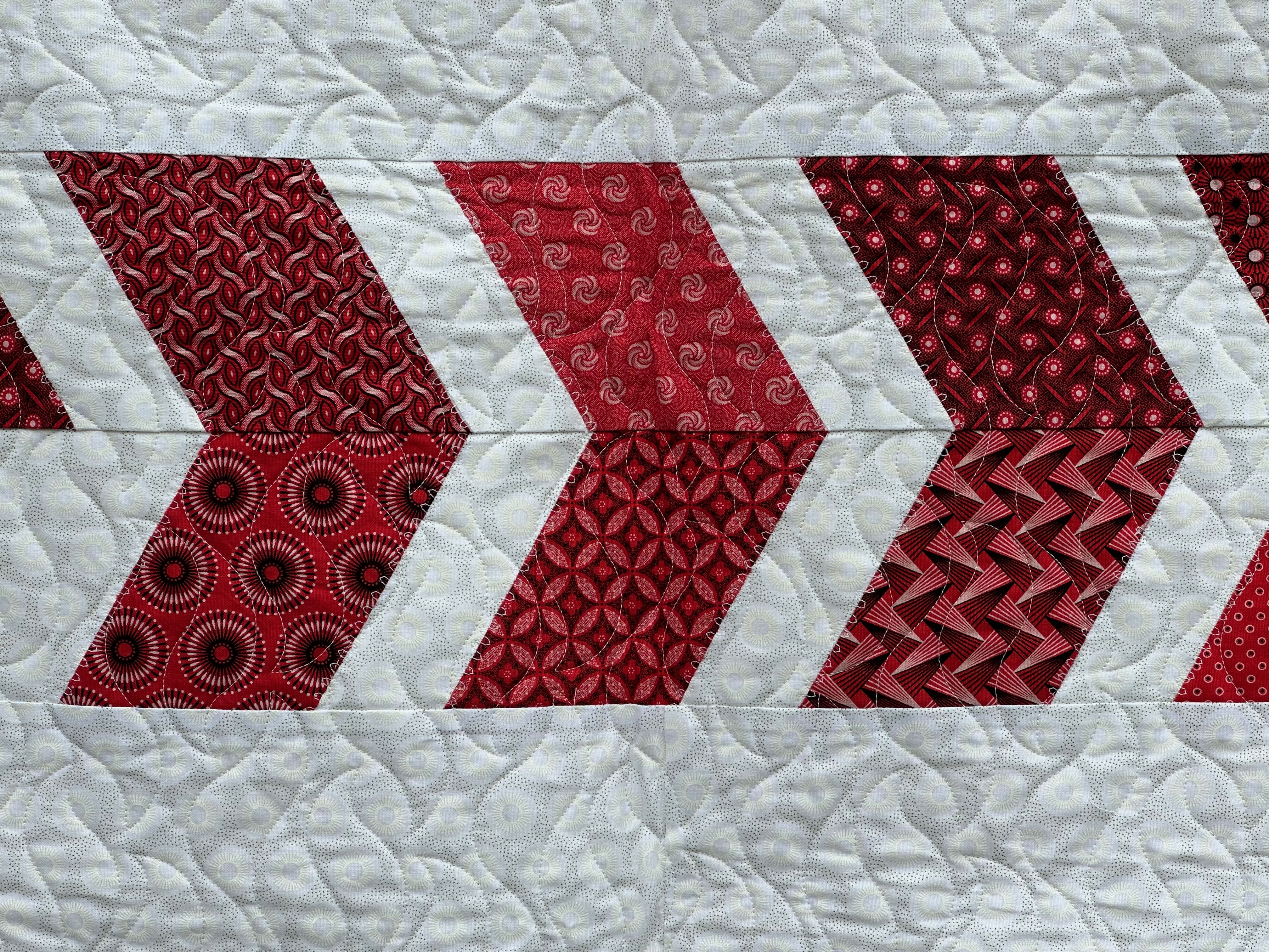 Each red fabric represents a different letter of the alphabet. The red and white colors are a nod to quilting history. The Turkey red dye was a desirable choice for fabric in the 1740’s and 50’s, as the red color did not fade with washing or from being in sunlight. However, there was an exorbitant cost for importing and exporting the Turkey red dyed fabric from where it was first developed (the origin of the dyeing process is unclear – possibly beginning in Greece or India). With the time of up to four months and labor necessary for dyeing the cotton, Turkey red was a symbol of wealth and status.
