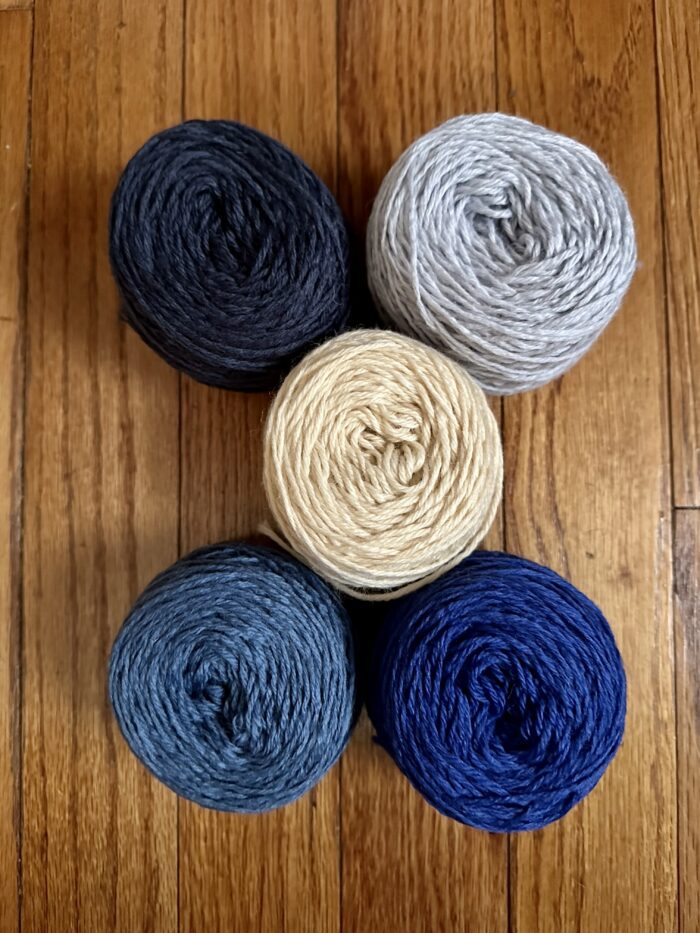 Which colors will I use? The Knit the Sky Scarf Project recommends picking five colors as the basis for the stitching. Strands of two different colors can be stitched together to provide additional color options. To represent the blue-to-gray skies I’ll observe, I am using the following yarn colors available from The Tempestry Project: Aurora, Downpour, Cumulus, Albedo, Nebula. I am a fan of these earthy colors, but any color combination can be used.