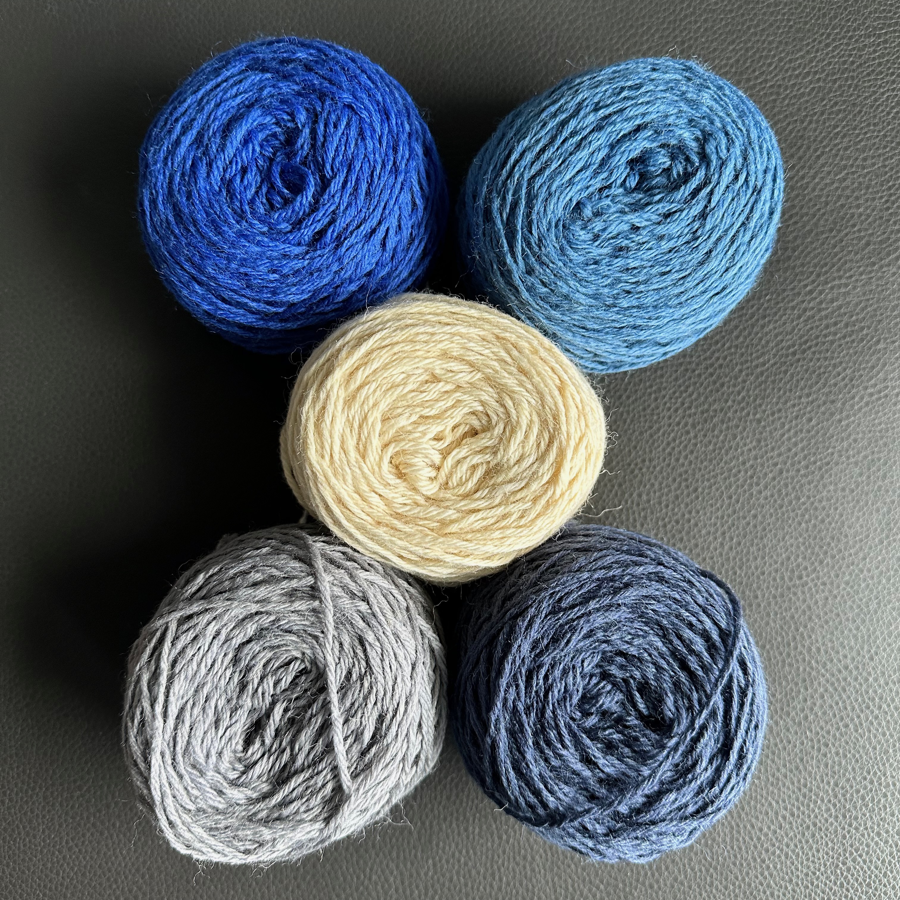 Which colors will I use? The Knit the Sky Scarf Project recommends picking five colors as the basis for the stitching. Strands of two different colors can be stitched together to provide additional color options. To represent the blue-to-gray skies I’ll observe, I am using the following yarn colors available from The Tempestry Project: Aurora (top left), Downpour (top right), Cumulus (middle), Nimbus (lower left), Nebula (lower right). I am a fan of these earthy colors, but any color combination can be used.