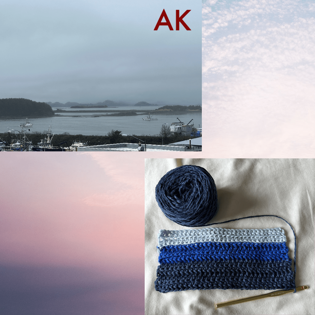 Photos: Announcing the Stitch The Sky At Sea Project (top left); Photos of blue skies at my home (Philadelphia) and where I had a one-night layover during travel (Seattle) with rows stitched onto the beginning edge (top left); Photo of what the sky has looked like every day I was in Kodiak before sailing – completely clouded over (top center); The five colors of yarn I’m using for the five shades of the sky I’m observing the same time each day (bottom center). The yarn is from The Tempestry Project and in the colors of Aurora (top left), Downpour (top right), Cumulus (middle), Nimbus (lower left), Nebula (lower right).