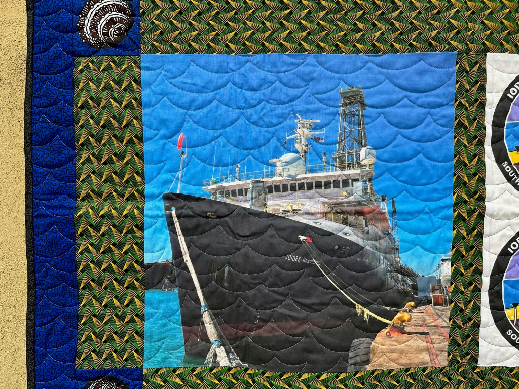 These objectives appear in the expedition patches displayed on the right side of the quilt. The left side of the quilt is JOIDES Resolution pictured in Cape Town, South Africa, right before departure for Expedition 390 in April 2022. The four objects in the corner of the quilt represent the drill cones found on the drill bit used for coring deep-sea material.