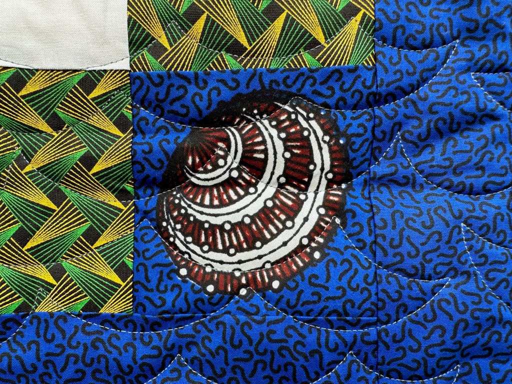 The two image panels were printed by Spoonflower.com. The majority of the fabric for this quilt was purchased in Cape Town, South Africa, at Mnandi Textiles (green/yellow 3 Cats Shweshwe fabric, a Da Gama Textile manufactured in South Africa, ) and an additional fabric store down the street (blue border and “drill cones”). The long-arm quilting was completed by Old Country Store Fabrics (Intercourse, PA). Quilt measures 29 inches tall by 48 inches wide and was completed on June 29, 2023.