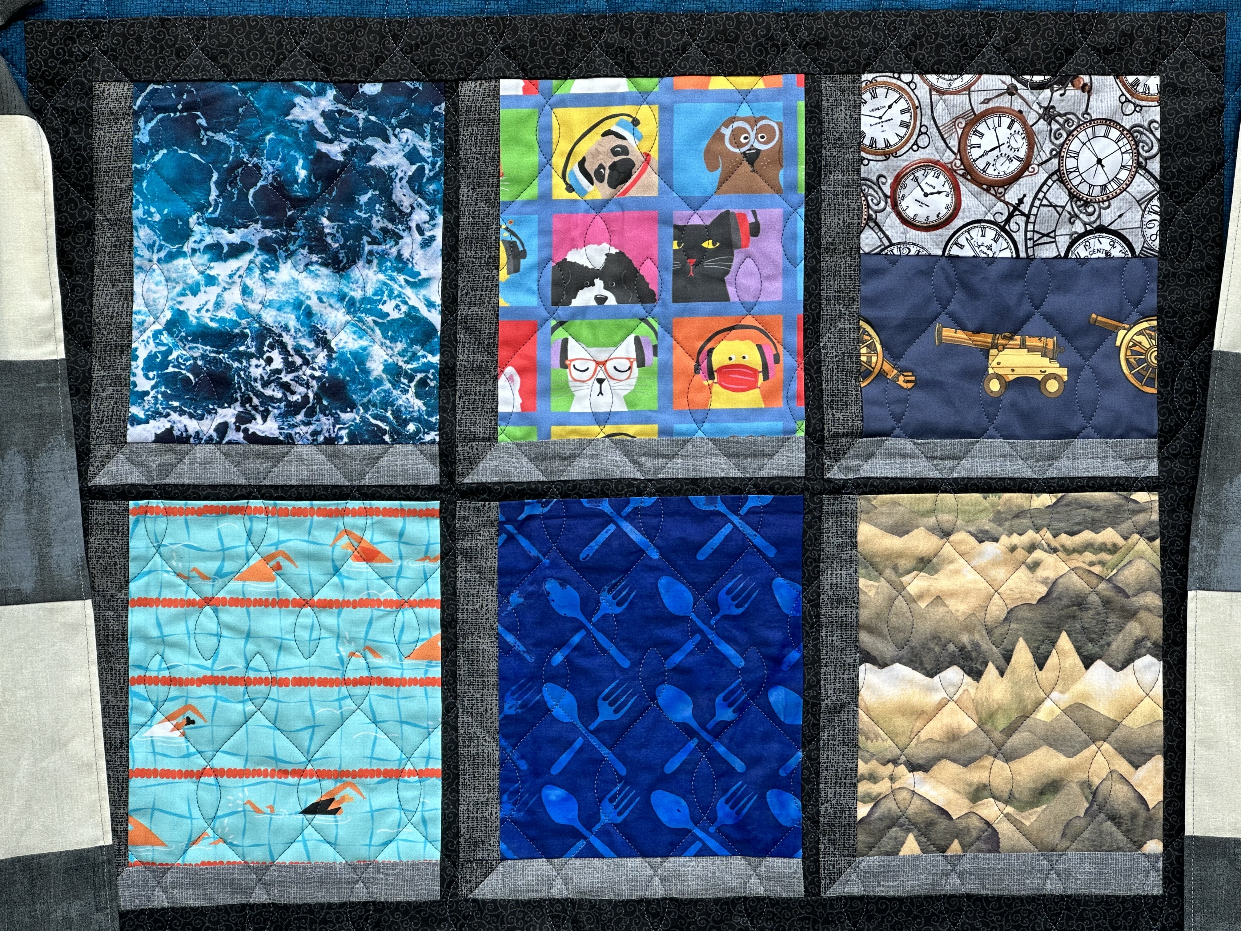 The top and bottom border fabrics are a nod to the co-chief scientists for Expedition 390. Roz Coggon designs and sells her own fabric, including the one featured on the quilt. Jason Sylvan was determined to improve his yo-yo skills while at sea, as yo-yoing is an activity he shares with his son.
