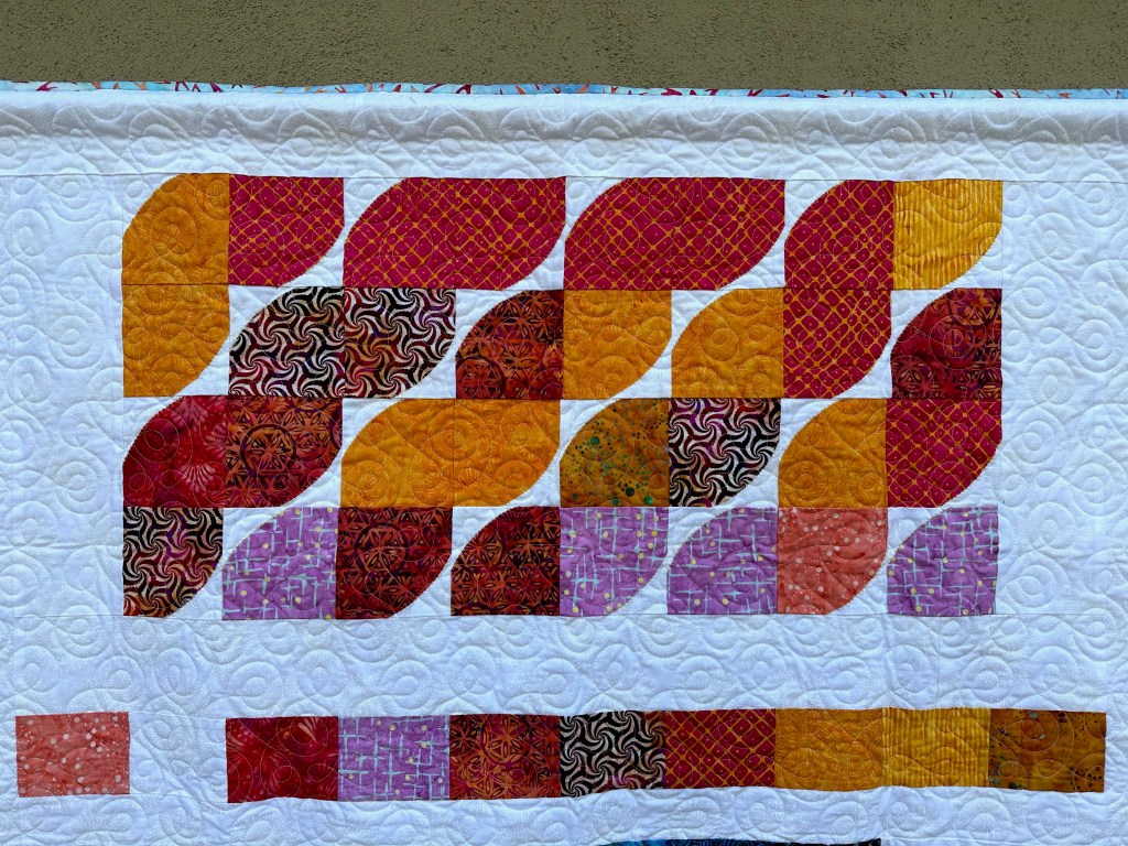 Red/pink/orange batiks are used to represent air temperatures, and batiks in shades of blue are for seawater temperatures. The binding fabric is orange and blue to bring together the two color schemes. The white fabric for the background is a Da Gama Textile (3 Cats Shweshwe) manufactured in South Africa. Longarm quilting services provided by The Old Country Store Fabrics in Intercourse, PA.