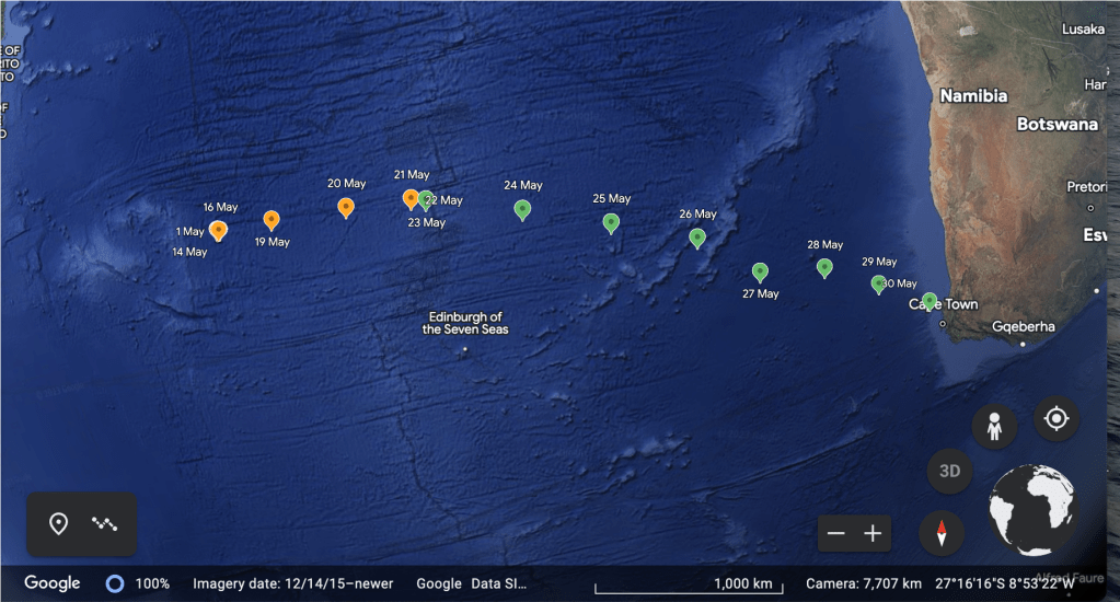 Important to note is the location of the ship when the temperature measurements were recorded. May 23 is the date the JR began its transit east in the South Atlantic Ocean back to Cape Town, South Africa, for the conclusion of the expedition. On the quilt, May 23 is the first data point (far left side) in the bottom row in the air and seawater sections. The coldest seawater temperatures at the end of the expedition were due to the colder, northward-flowing waters of the Benguela Current along with the upwelling of cold, nutrient-rich water off the west coast of South Africa. Not only does the Benguela Current have a cooling effect on the temperature of seawater, the air immediately above the current becomes cooled as well, which is recorded in the quilt with the coldest air temperatures also from May 23 until the ship docks in Cape Town.