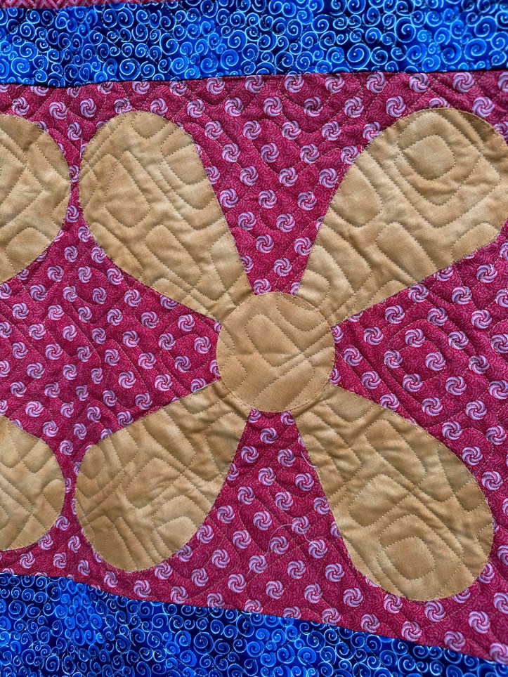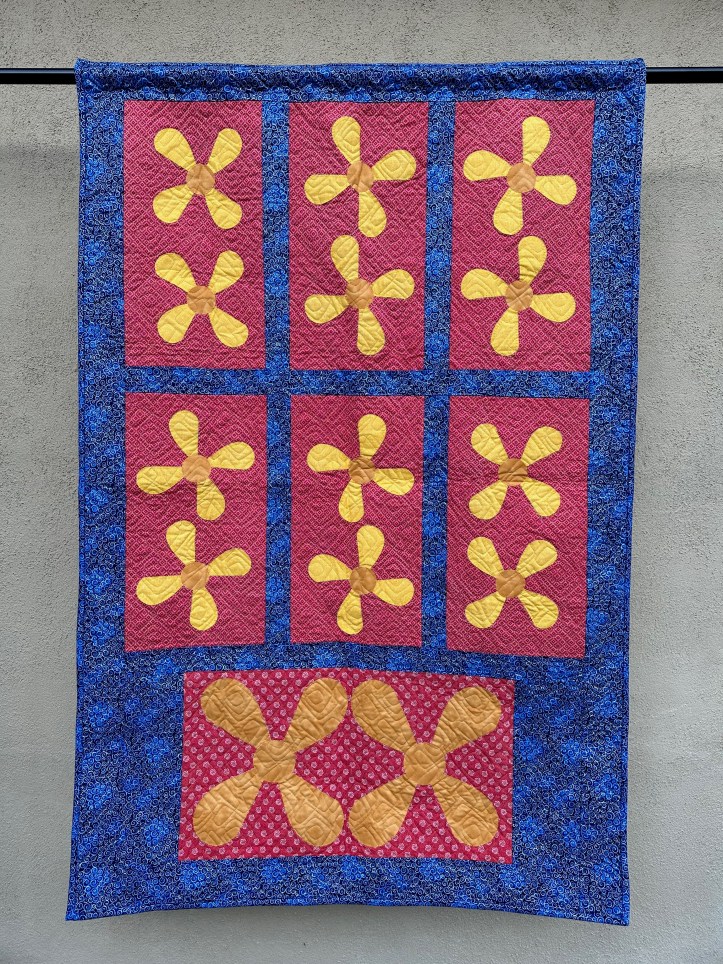 The yellow/gold colors represent the brass alloy of which the propellers are composed. The thruster blades are paired to represent the thruster pods as they exist on the ship, and they are stitched on to red fabric to represent the red color of the ship’s hull. The red fabric for the hull is a Da Gama Textile (Three Cats Shweshwe) manufactured in South Africa, where the ship departed from/returned to for my time at sea during Expedition 390. The blue spiral metallic fabric represents the motion of the water when the thrusters are rotating and is a Blank Quilting fabric. The Longarm quilting services were provided by The Old Country Store Fabrics in Intercourse, PA.