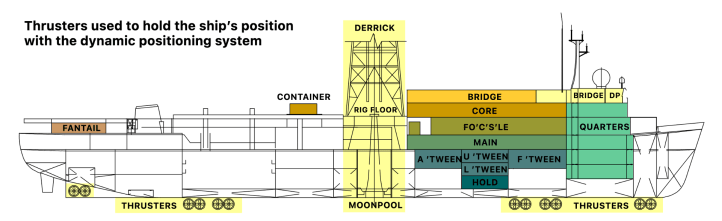 If you are interested in a full description of the dynamic positioning system on JOIDES Resolution, I encourage you to check out the blog post on Dynamic Positioning from Expedition 395’s Onboard Outreach Officer Jennifer Field