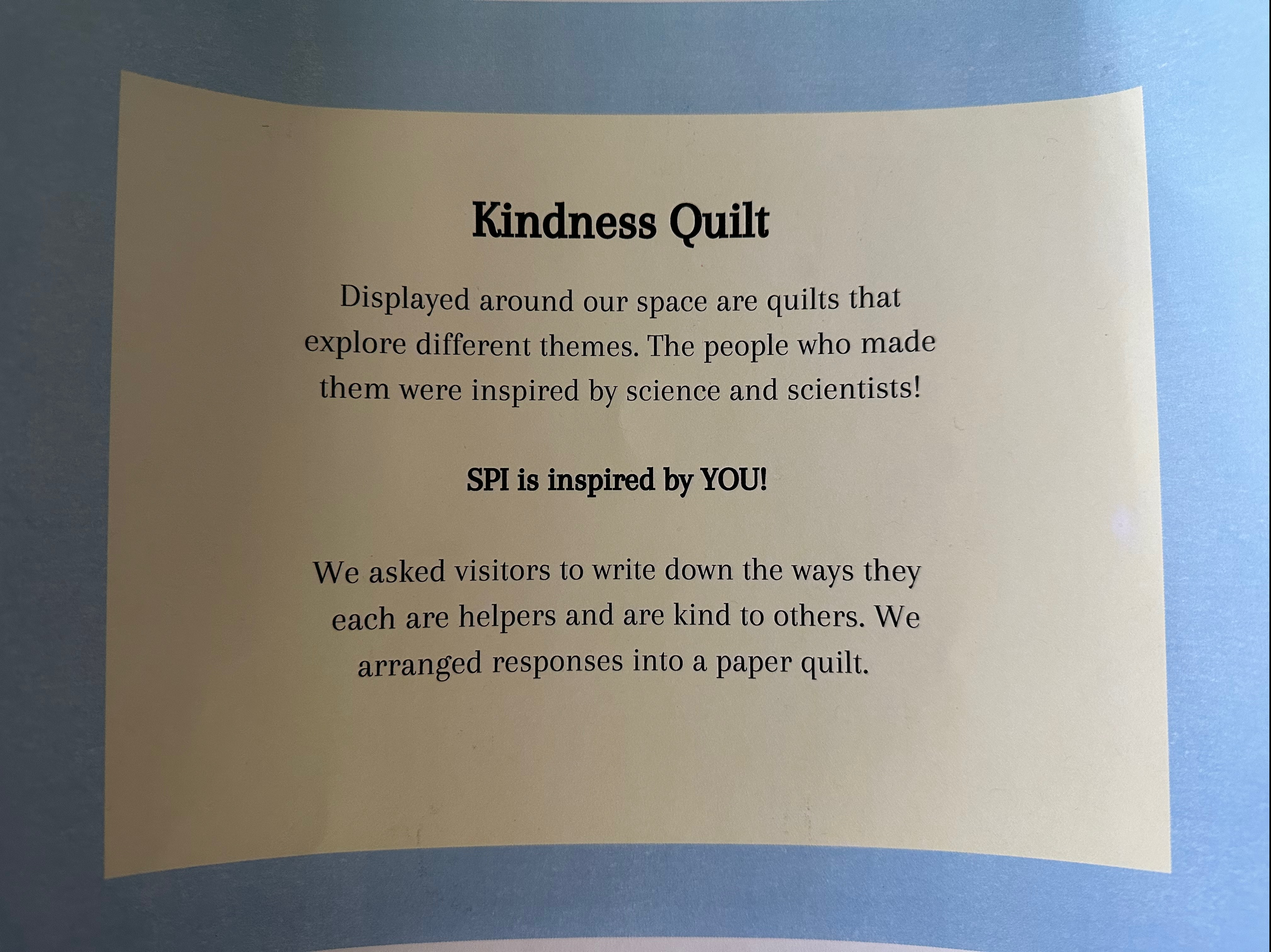 From April to August 2023, the quilts were on display! Alas, I unfortunately do not have any photos of the quilts on display, but SPI was kind enough to send me some of the signage they hung up, and the results of a community “quilt” project!