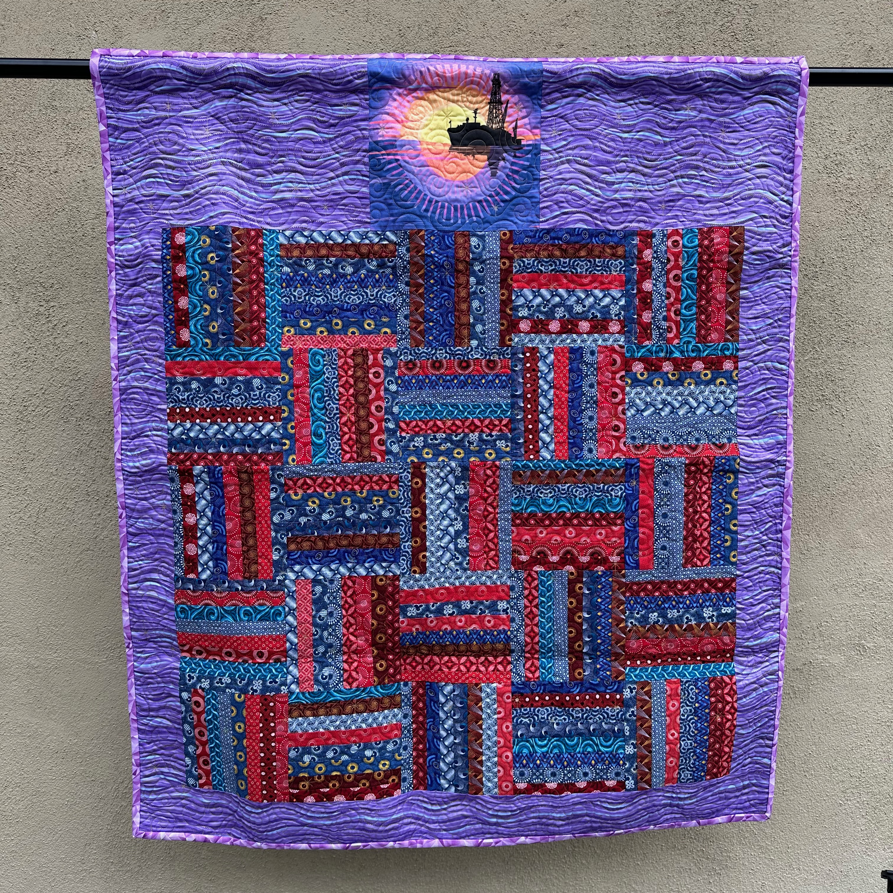 The blue and red colors in the center section of the quilt represent the two colors found on the hull of JOIDES Resolution. These fabrics are also a Da Gama Textile (Three Cats Shweshwe) manufactured in South Africa, where the ship departed from/returned to for my time at sea during Expedition 390. The top ship graphic is a design created by one of my co-chief scientists, Rosalind (Roz) Coggon and is available on Spoonflower.com as JOIDES Resolution Sunset on the South Atlantic Transect. The background fabric is Laurel Burch Basics Dark Purple Wave Metallic Fabric. Longarm quilting services were provided by The Old Country Store Fabrics in Intercourse, PA.