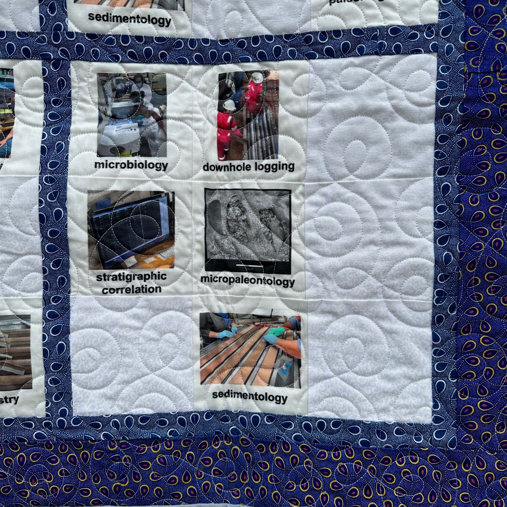 The photos were printed on fabric through Spoonflower.com. The blue grid and border fabrics are a Three Cats Shweshwe fabric manufactured by Da Gama Textiles in South Africa. For Expedition 390, JOIDES Resolution departed from and returned to port in Cape Town, South Africa.