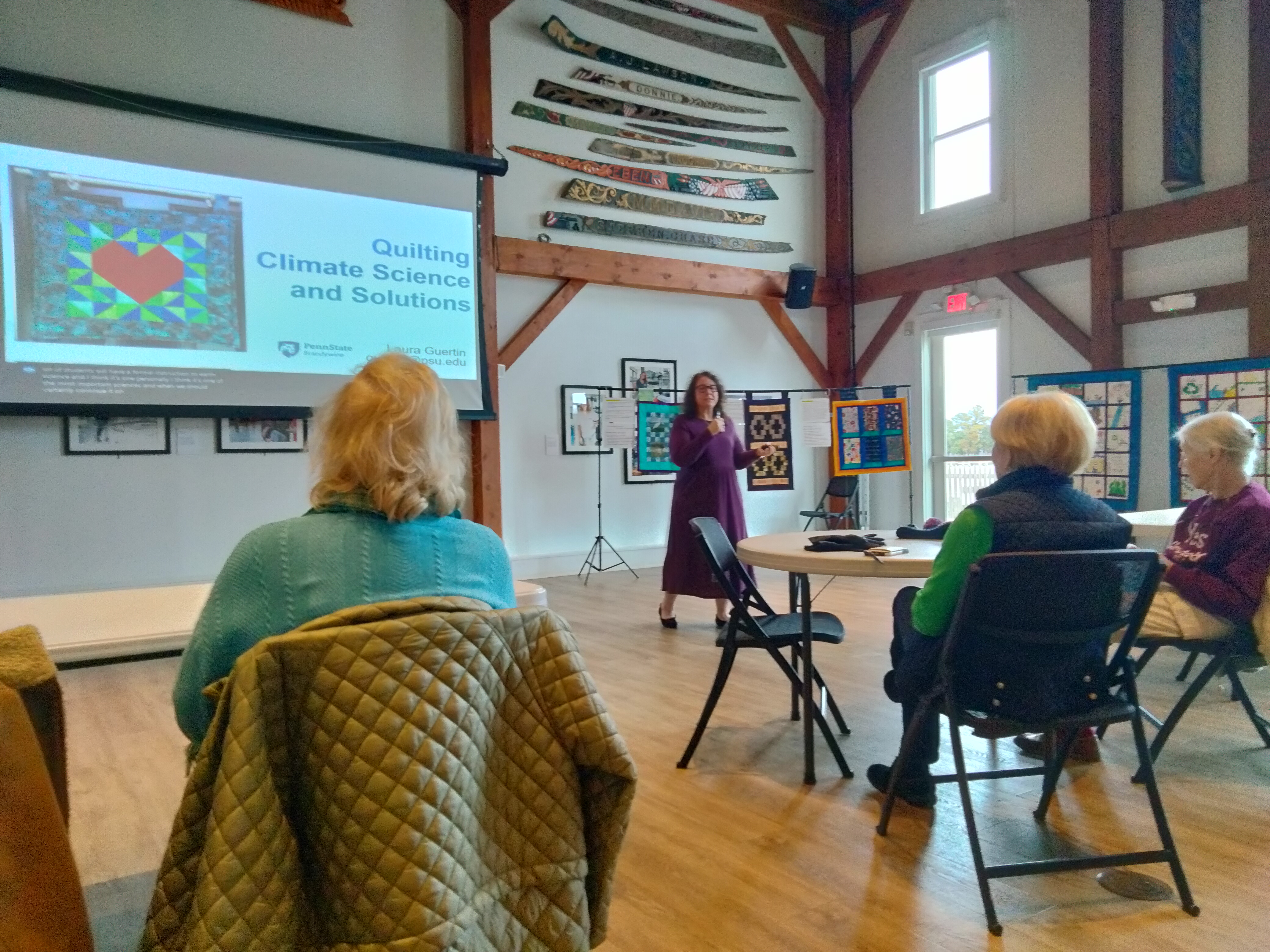 After the opening reception, I returned to the Chesapeake Bay Maritime Museum on January 4, 2024, to give a lecture on “Quilting Climate Science & Solutions.” I brought my Drawing Down Towards Climate Solutions quilts to display, along with the two quilts generated by my students in the Fall 2023 semester the explored coastal solutions to climate change. It was a great presentation in an incredible presentation space, the Van Lennep Auditorium on the CMBB campus. And we had such a rich Q&A session, I think I learned as much from the audience about their local coastal challenges as I shared with them!
