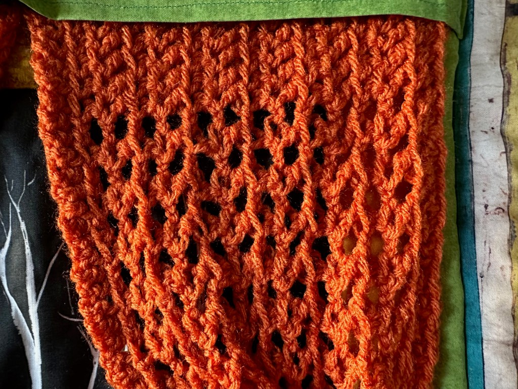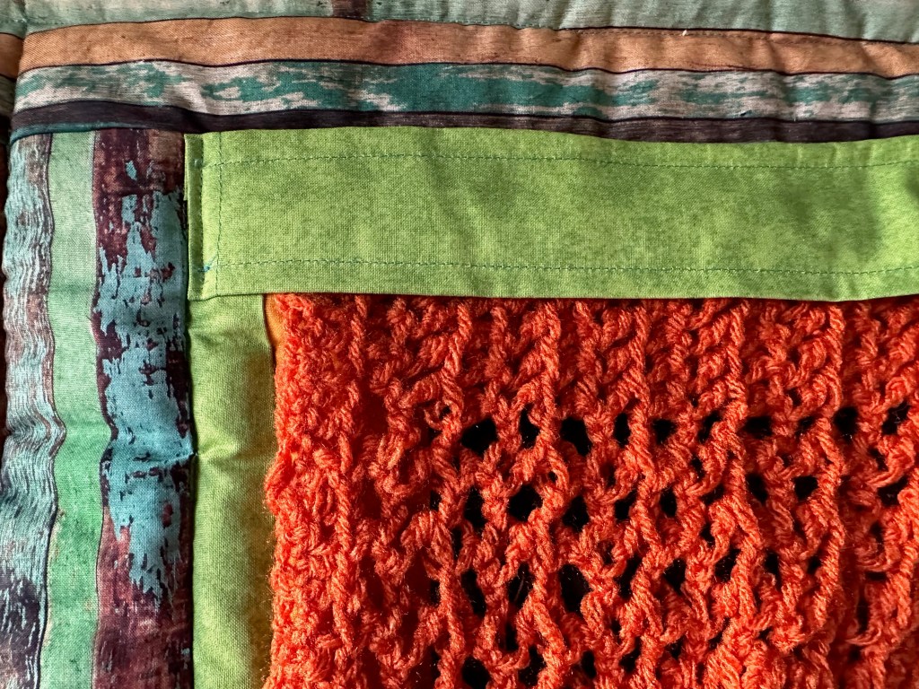I eventually went back to the quilt and tried to figure out how I could make it look more like a window. I thought, what do all windows have? Curtains! But with the quilt top completed, I wasn’t sure how to add this feature. I knew curtains made of fabric would lie flat, and I wanted something that would have more of the natural folds of a curtain. I had never merged quilting with another medium before, and I’m not sure how I came up with the idea to crochet curtains to attach, but this is exactly what I did. The top of the curtains didn’t look very clean when I attached them to the quilt, so I also created a strip of fabric to cover the very top of the curtains, and we had a winner! This ended up being the 84th quilt I created, completed on August 8, 2022. The quilt measures 25 inches across by 29 inches tall (phew! Just under the size limit!) That same day, I submitted my entry for consideration.