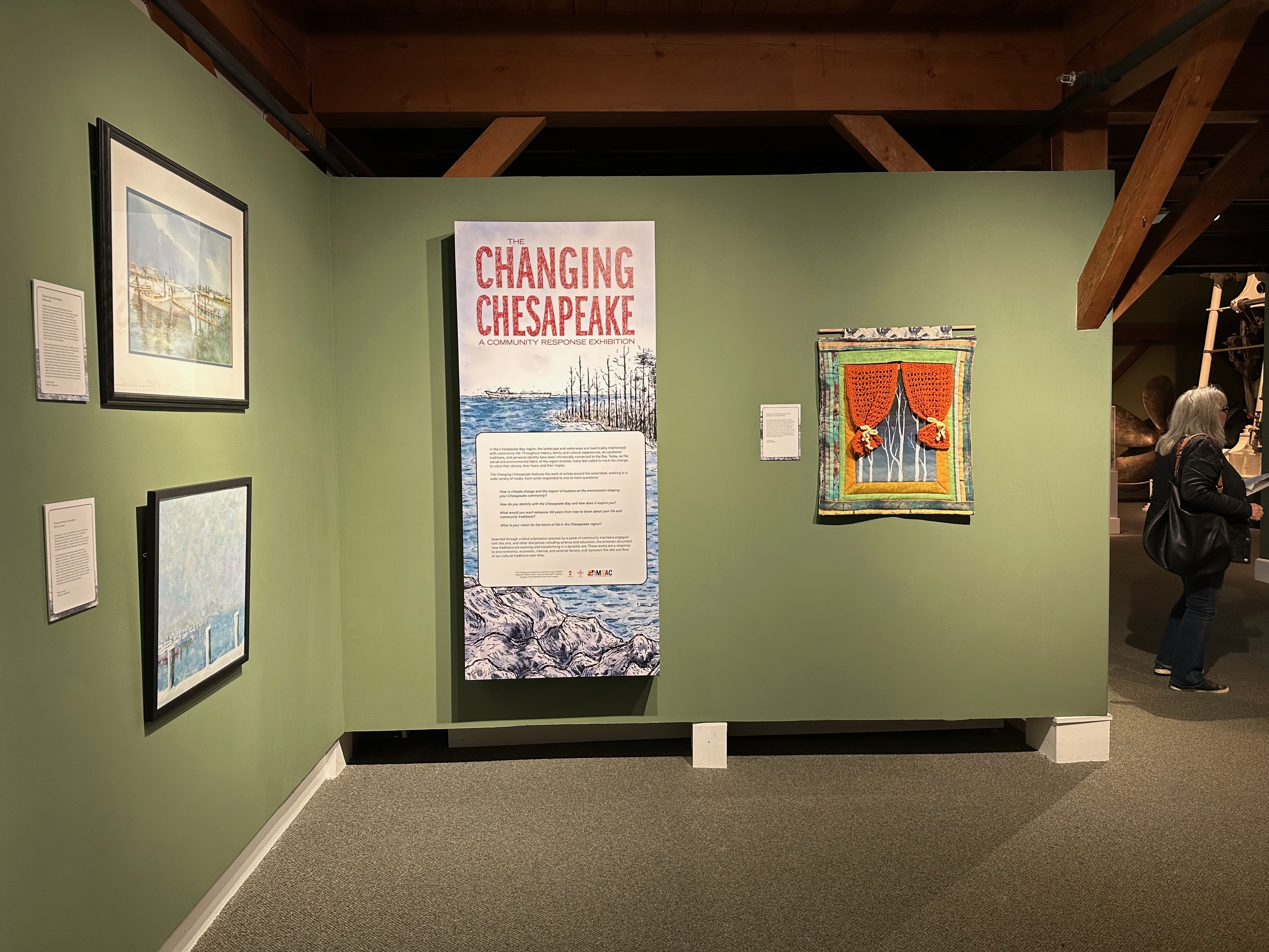 I immediately burst into tears, which I didn’t expect to happen. I just couldn’t believe that I had a quilt hanging in a museum, and at the entrance of the exhibit! The volunteers were so kind and even hugged me when I explained how much it meant to have my quilt as part of The Changing Chesapeake. I did a quick walk-through of both floors of the exhibit space, housing the 75 pieces selected for display. Then for the next two hours, I stood by my piece and shared stories of not only how I created the quilt but some of the science behind ghost forests. I was interviewed by a couple of news outlets, and I was quoted in at least seven articles appearing in outlets such as Chesapeake Bay Magazine and The Talbot Spy.