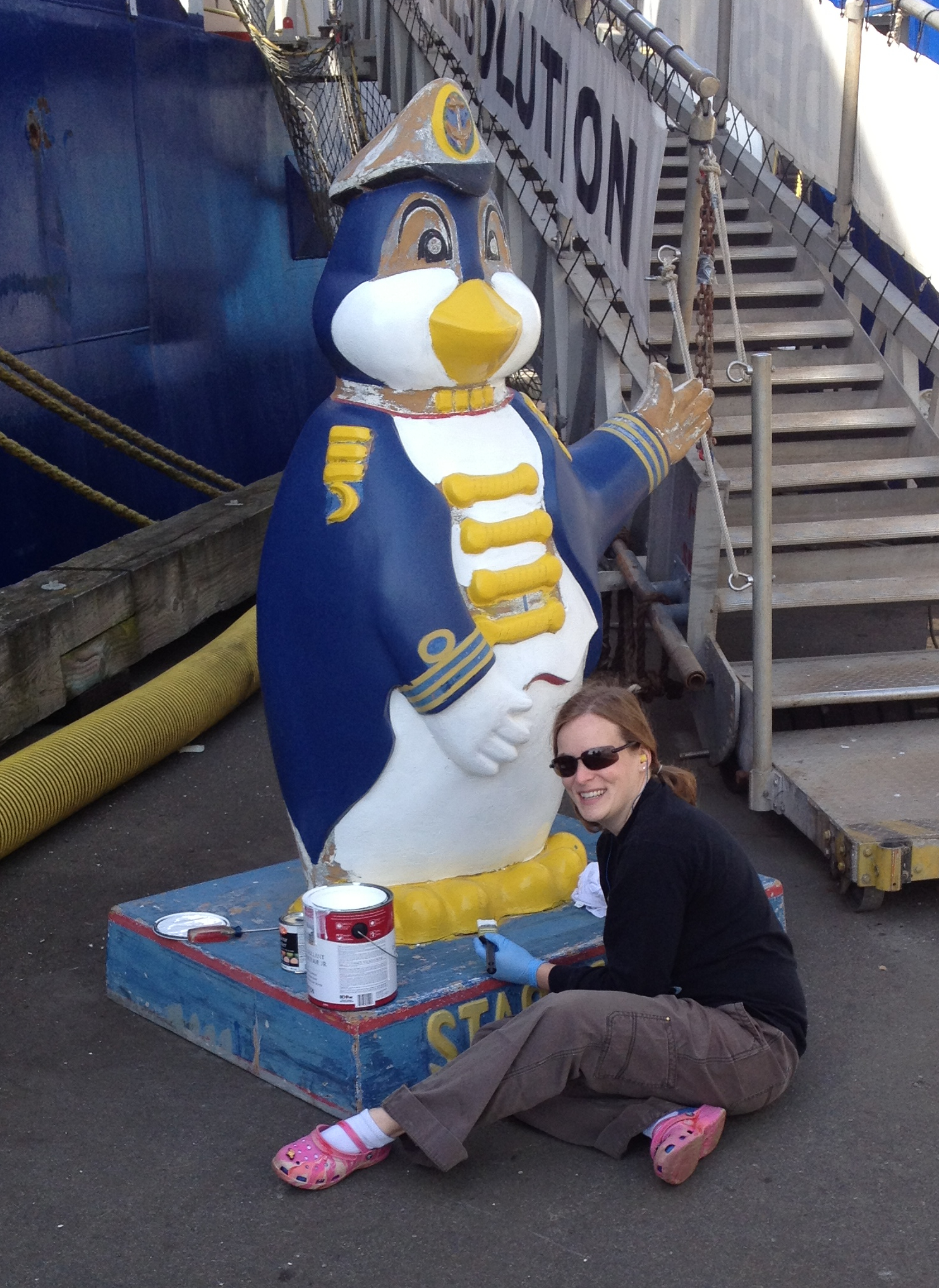 The story now shifts back to the JR, docked in Victoria during the month of April and beginning of May in front of a cable repair ship. One of the crew from the cable repair ship purchased a giant penguin statue from the Garage Sale and brought it back to their ship where the statue sat on the dock. In fact, when the ship left port, it left the penguin behind. The JR technicians eyed this abandoned statue and dragged it down to their ship. The JR’s Chief Mate, a Siem Offshore crew member, connected with the harbor authority to get in touch with the cable repair ship. Did they mean to leave the penguin behind? Did they still want the statue? That ship gave permission for the JR to keep the statue, and the JR deck crew and technicians began repairs and provided the penguin a fresh coat of paint and a name.