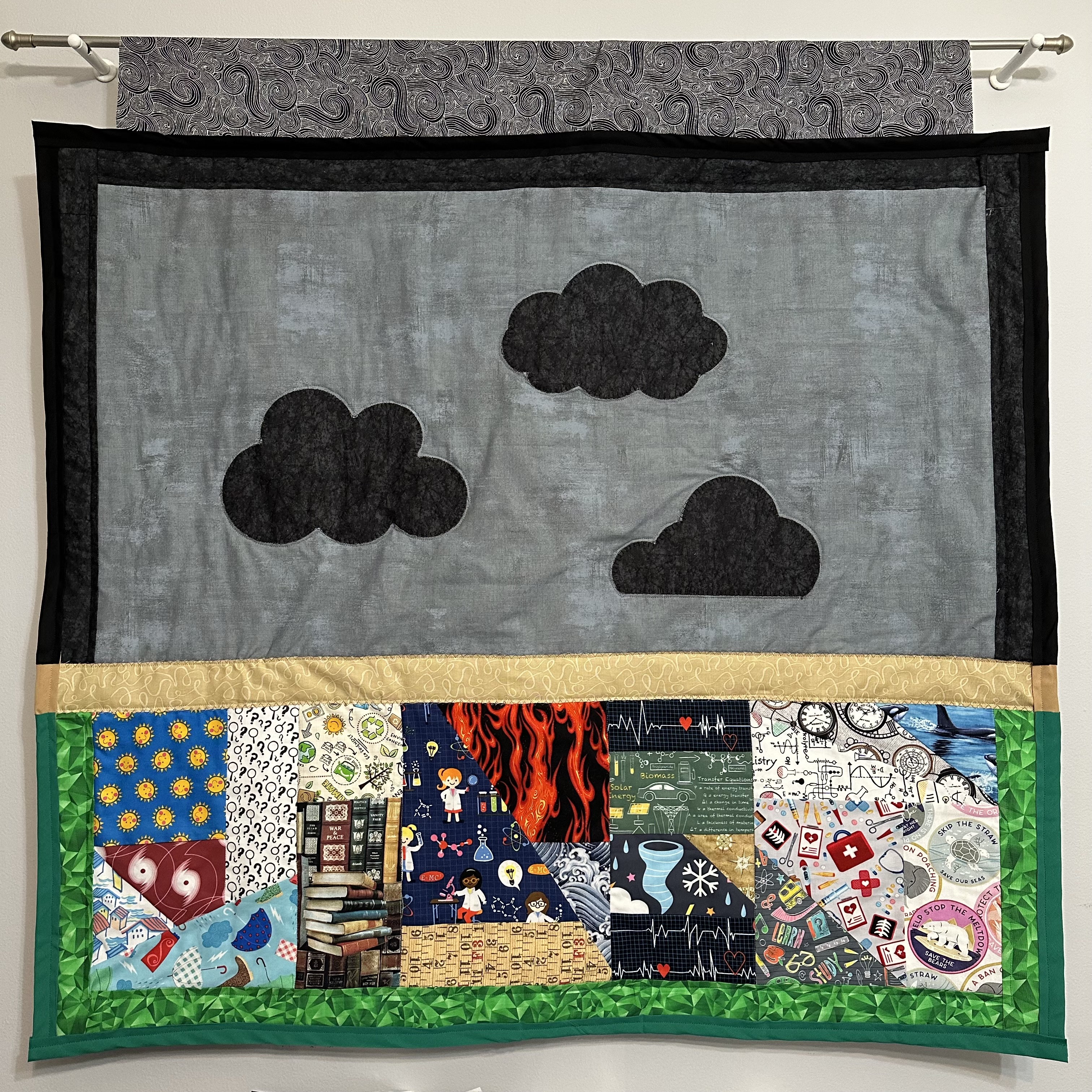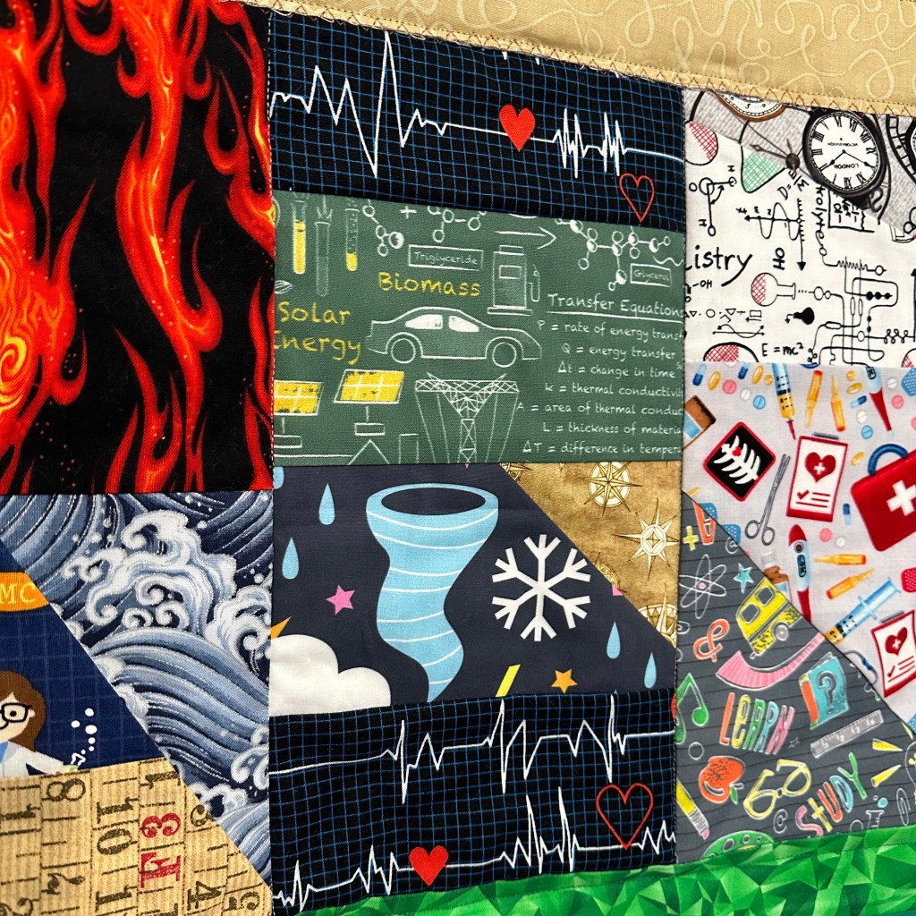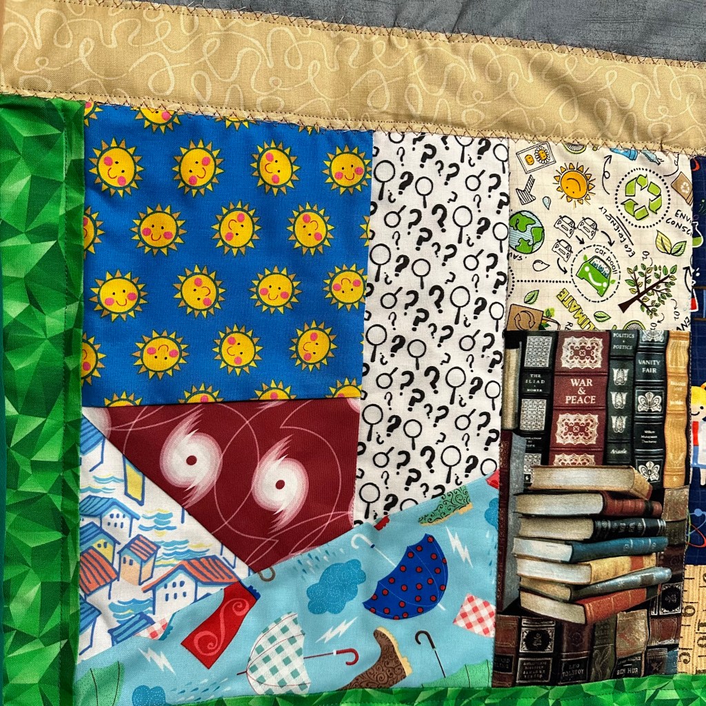 The fabrics below the drought layer are part of the surface of our planet (or now pushed below ground – not sure where I want them placed in the story) and represent themes critical to me (at least the topics I had fabric for): the environment, climate impacts, the ocean, women/girls in STEM, health, education, literacy in reading and asking questions to make data-informed decisions – and that we are running out of time and a clear direction to make advances in all of these fields. I stitched all of these fabric scraps as a crazy quilt – to me, representing the increased chaos now moving forward in all of these fields. The green border around the lower-half of the quilt I used to represent growth, hope, and opportunity for moving forward.