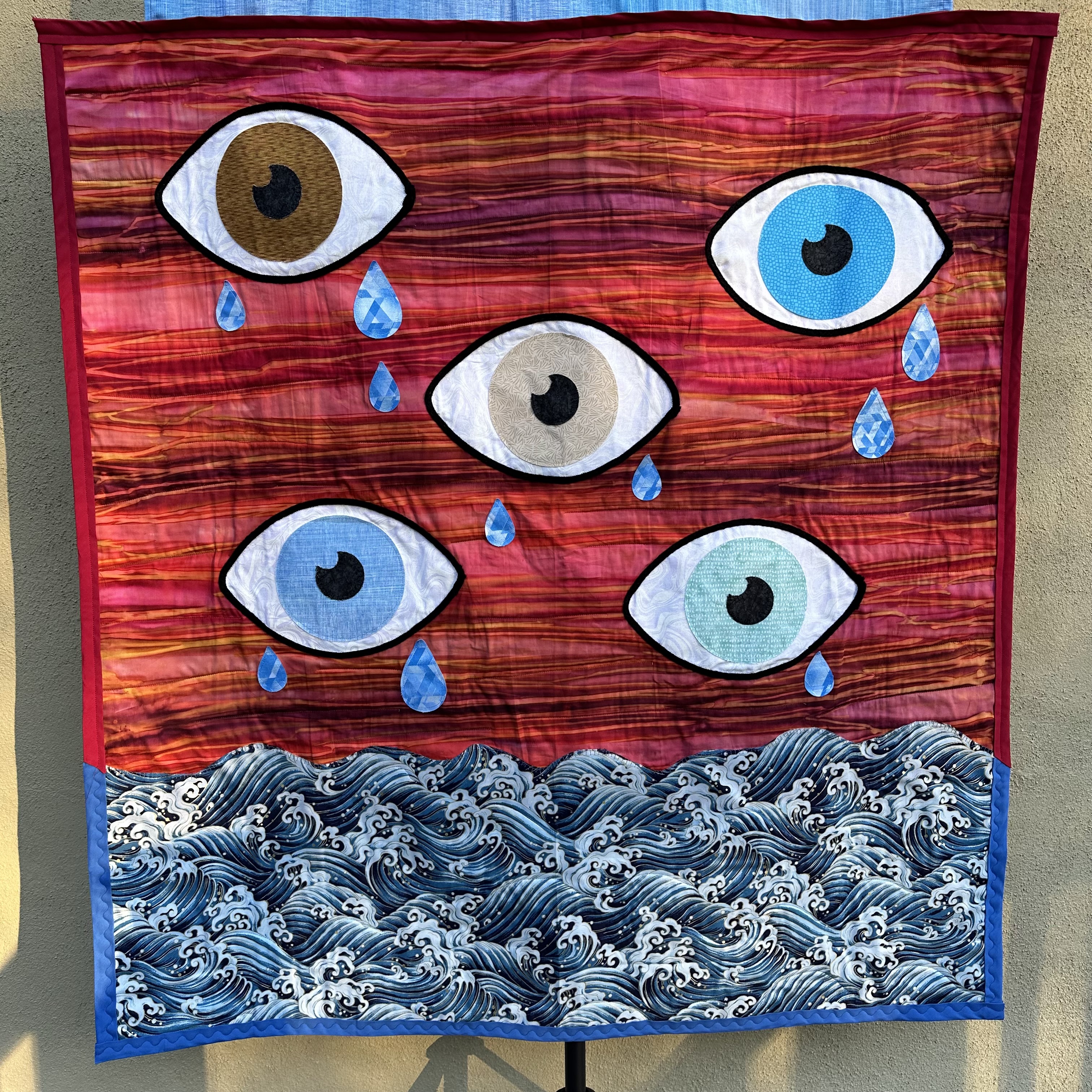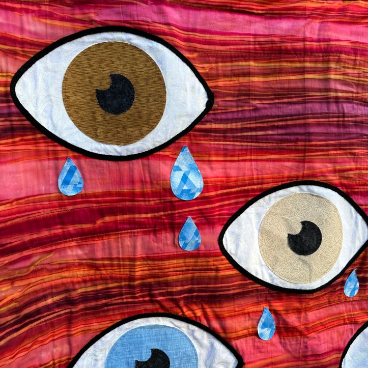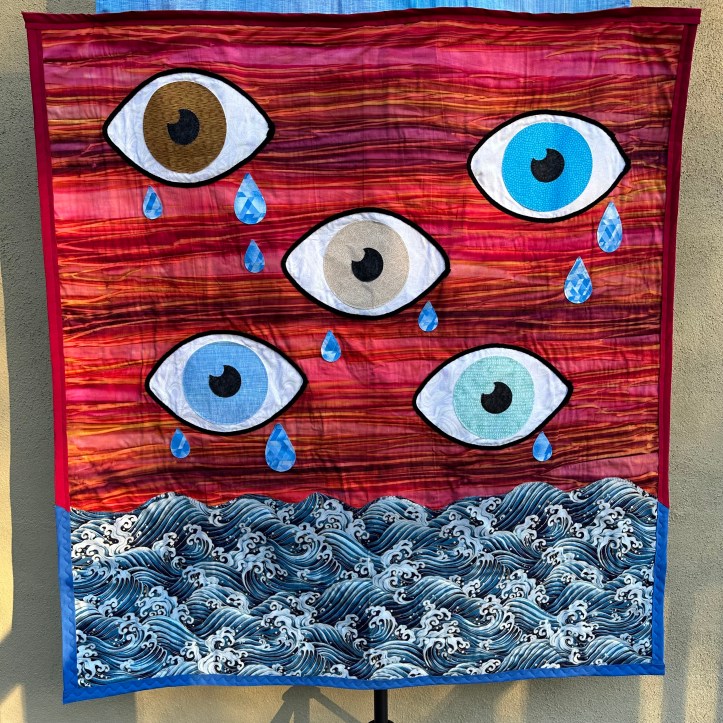 As soon as I completed my Processing quilt, the idea for this quilt immediately came to me. I knew what I wanted it to look like, but I’ve struggled to develop the description for it. I think this quilt could be viewed so many different ways to different people. Overall, it is a set of diverse eyes crying tears that are filling an ocean of chaos. The red background is a burning sky, or a warning, or continued anger, or…?