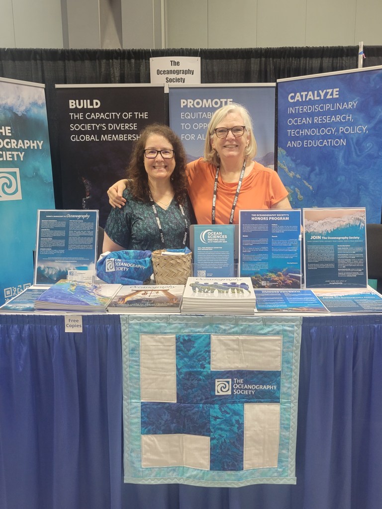 I presented Jenny with the quilt at the American Geophysical Union meeting in Washington DC last week, and she immediately decided to clip the quilt to the front of the TOS booth in the Exhibit Hall. The quilt was designed to be a small, hanging quilt – and immediately the quilt started serving in the role! As the current quilts I gift to people are designed as wall hangings, I will continue to sign/date/record them in my quilt log, but I don’t think I’ll include instructions for care and maintenance. The new owners of my quilts have the opportunity to use the quilts as they wish!