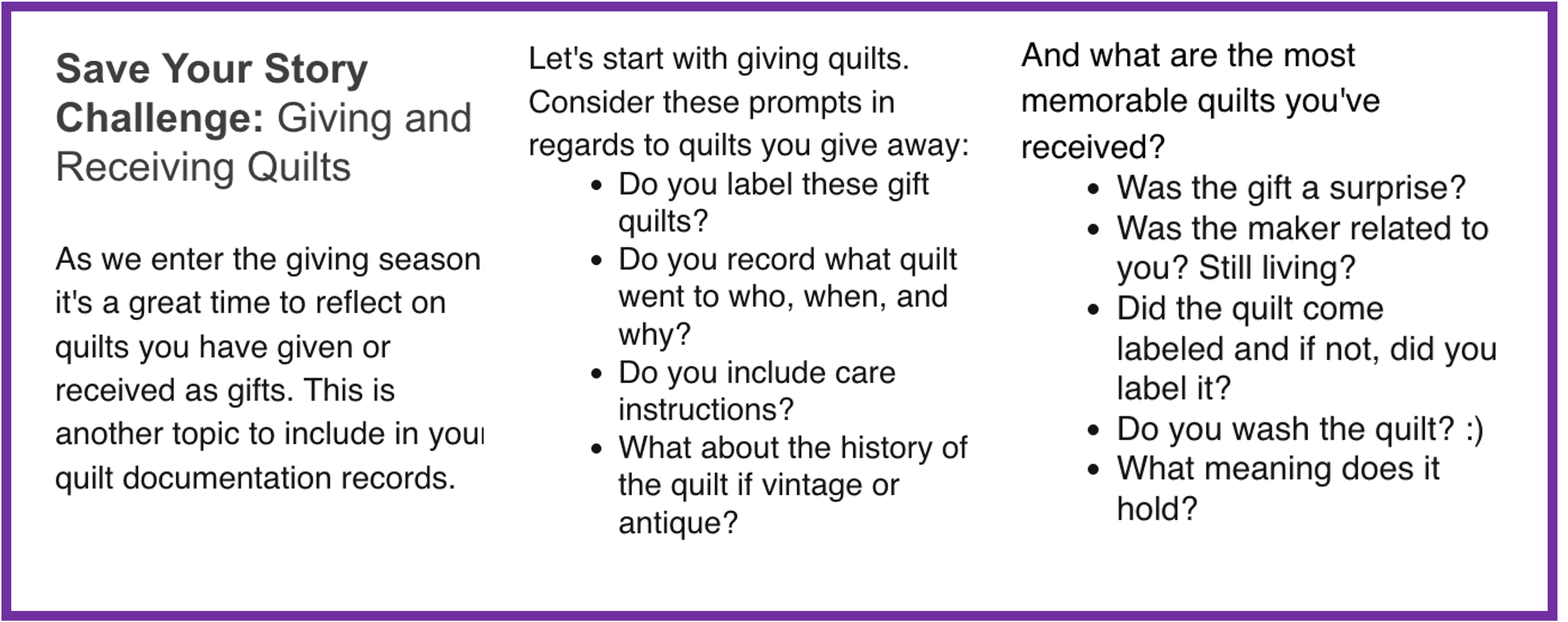 Now that the 2024 Save Your Story Challenge is concluding (so disappointing, as I have learned so much from going through this process!), it is time to go back and review all of my posts from this year. These blog posts are so valuable to have to revisit what I have done and what I have learned, to ensure I continue to build moving forward. Thank you, Quilt Alliance, for providing this opportunity!